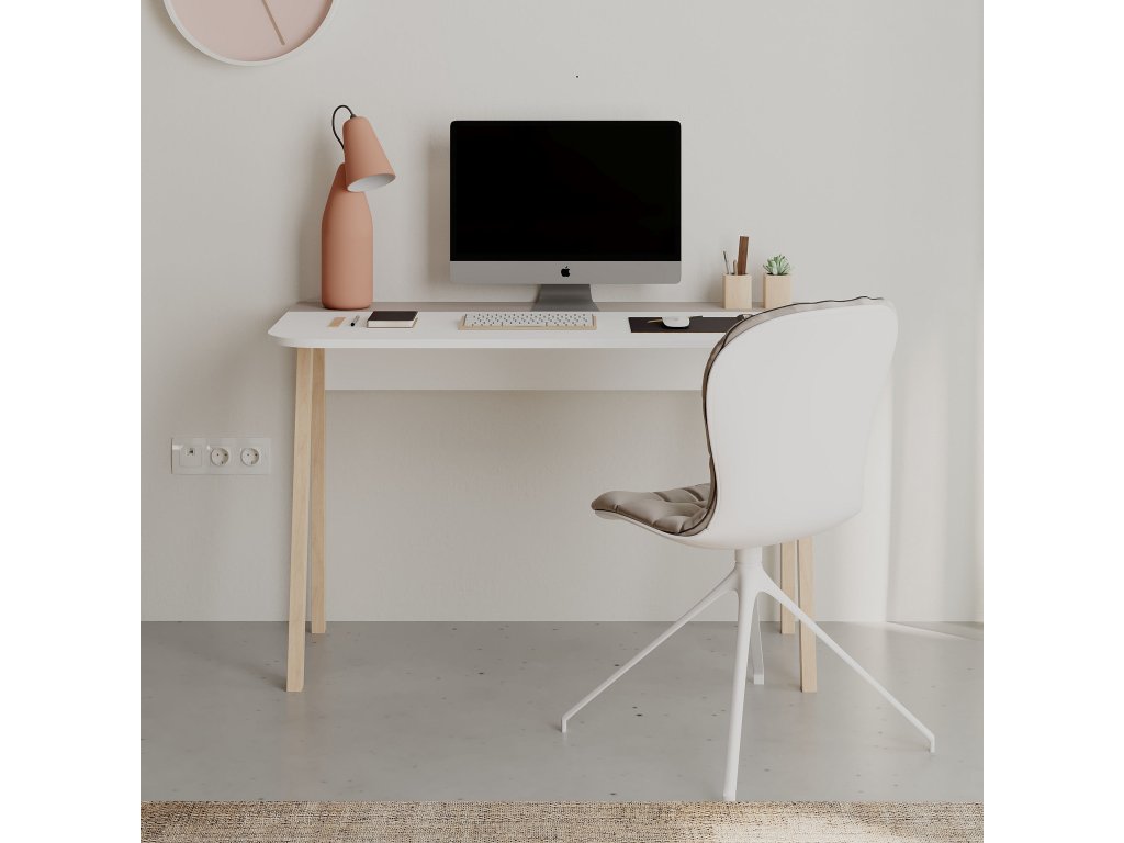 Psací stůl LUTON je vyrobený v bílé barvě, ozdoben dekorem mocca a doplněn dřevěnýma nohama přírodní barvy.