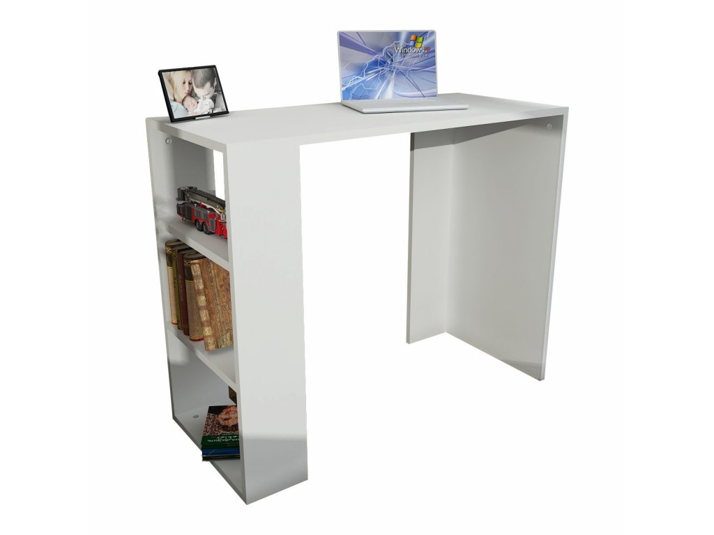Povšimněte si, že bílý psací stůl NETENYA má z jedné strany nosnou bočnici vyměněnou za prostorný regál nabízející úložné prostory.