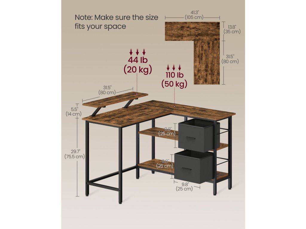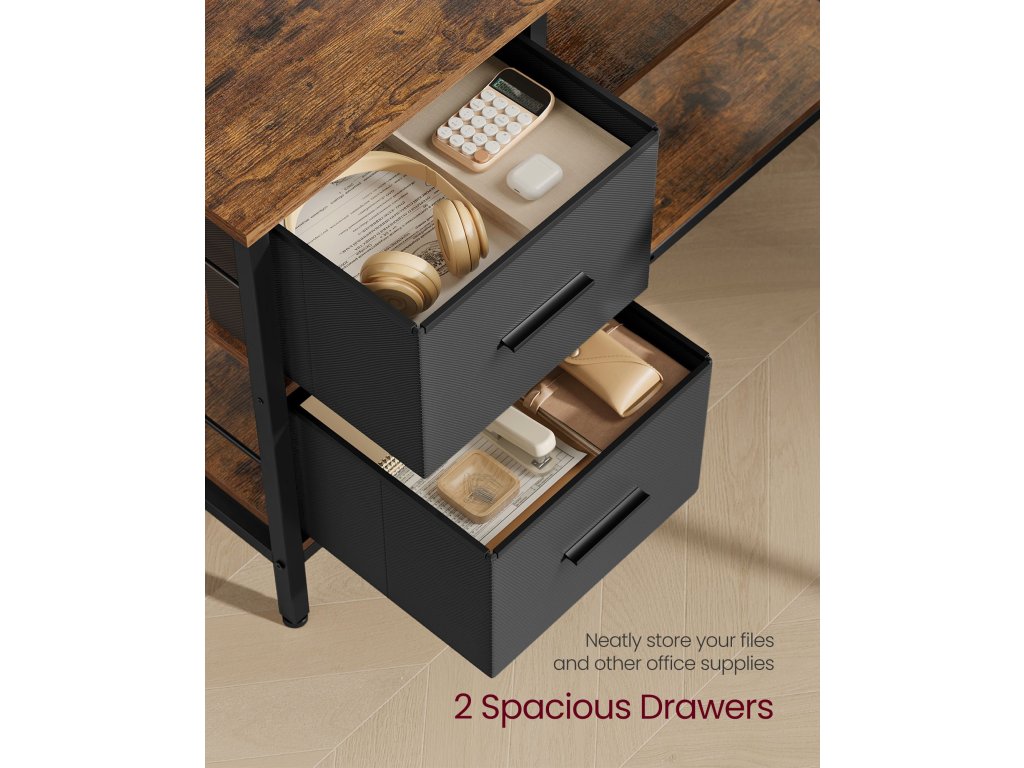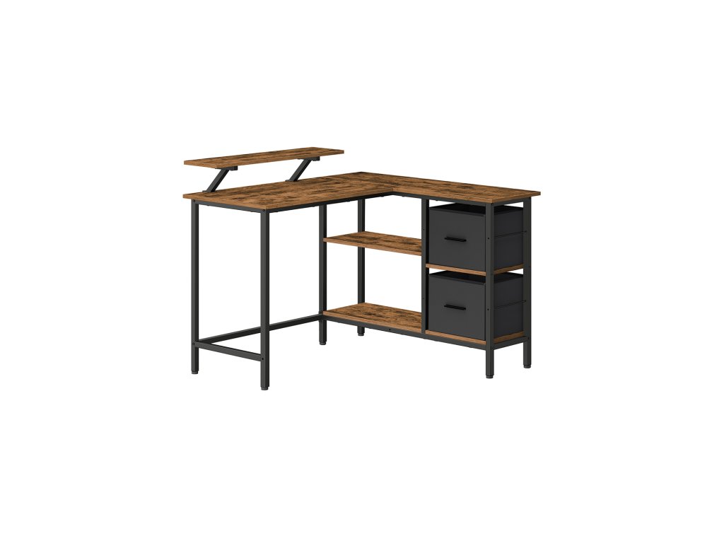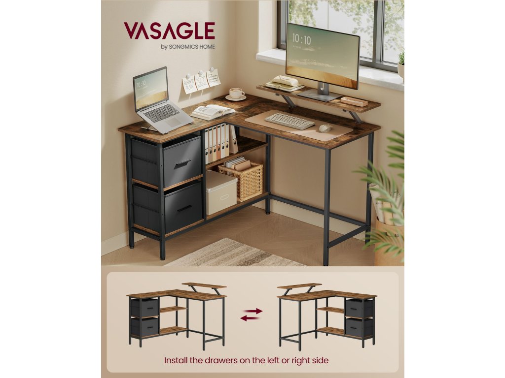 Psací stůl ve tvaru písmene L o rozměrech 105 x 115 x 89,5 cm má oboustrannou konstrukci, která umožňuje instalovat zásuvky na levou nebo pravou stranu a dokonale se hodí do každého rohu vaší domácí kanceláře, ložnice nebo obývacího pokoje.