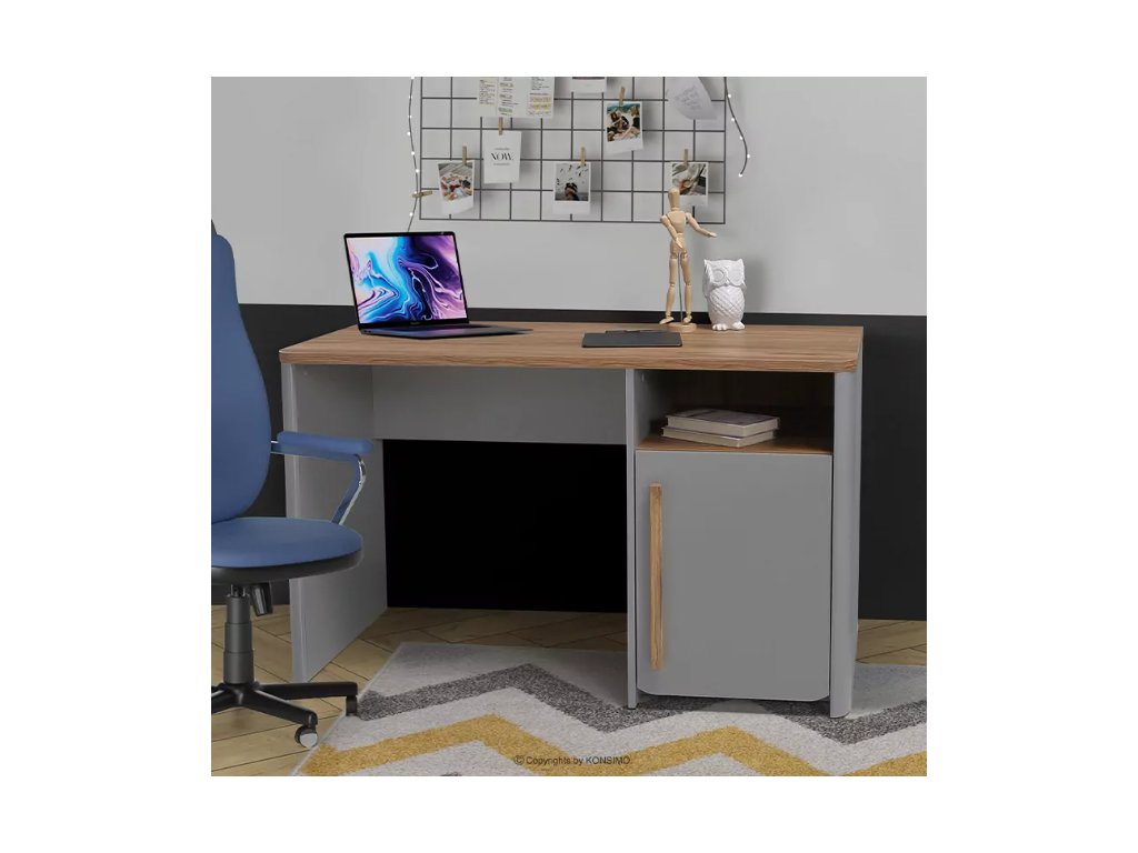 Psací stůl SURFINIO s otevřenou policí a skříňkou v šedé barvě s doplňky v dubovém dekoru.