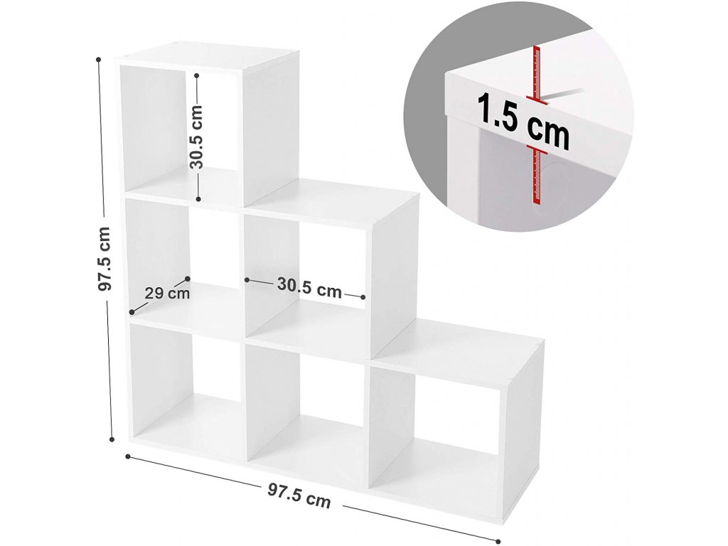 Stylová knihovna tvořená 6-ti kostkami nabízí velký prostor pro knihy a hračky. Otevřené police pro snadné vyzvednutí z obou stran. 15 mm zesílená dřevotřísková deska pojme až 15 kg. Povrch dýhy je odolný proti poškrábání a opotřebení. Všechny hrany jsou utěsněné a hladké na dotek.