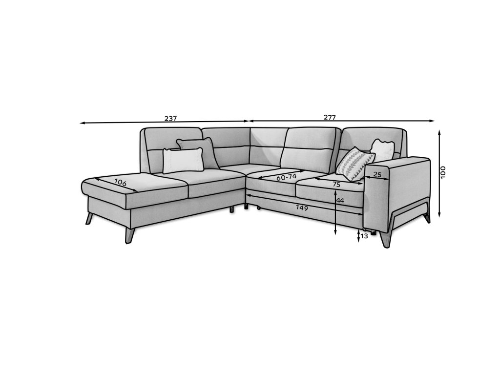 Rohová sedací souprava je vybavena mechanismem rozkládání typu DL s plochou na spaní 215x130 cm a úložným prostorem na lůžkoviny.