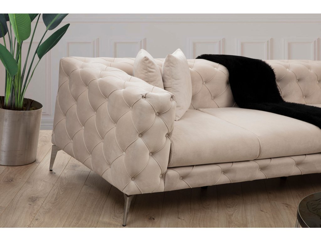 Kovové 17 cm vysoké nohy dodávají celé pohovce stabilitu a podporují i moderní chesterfieldový design. Rohová sedací souprava COMO R s béžovým čalouněním poskytuje nejen maximální pohodlí, ale také všestranný prostor pro relax a odpočinek.