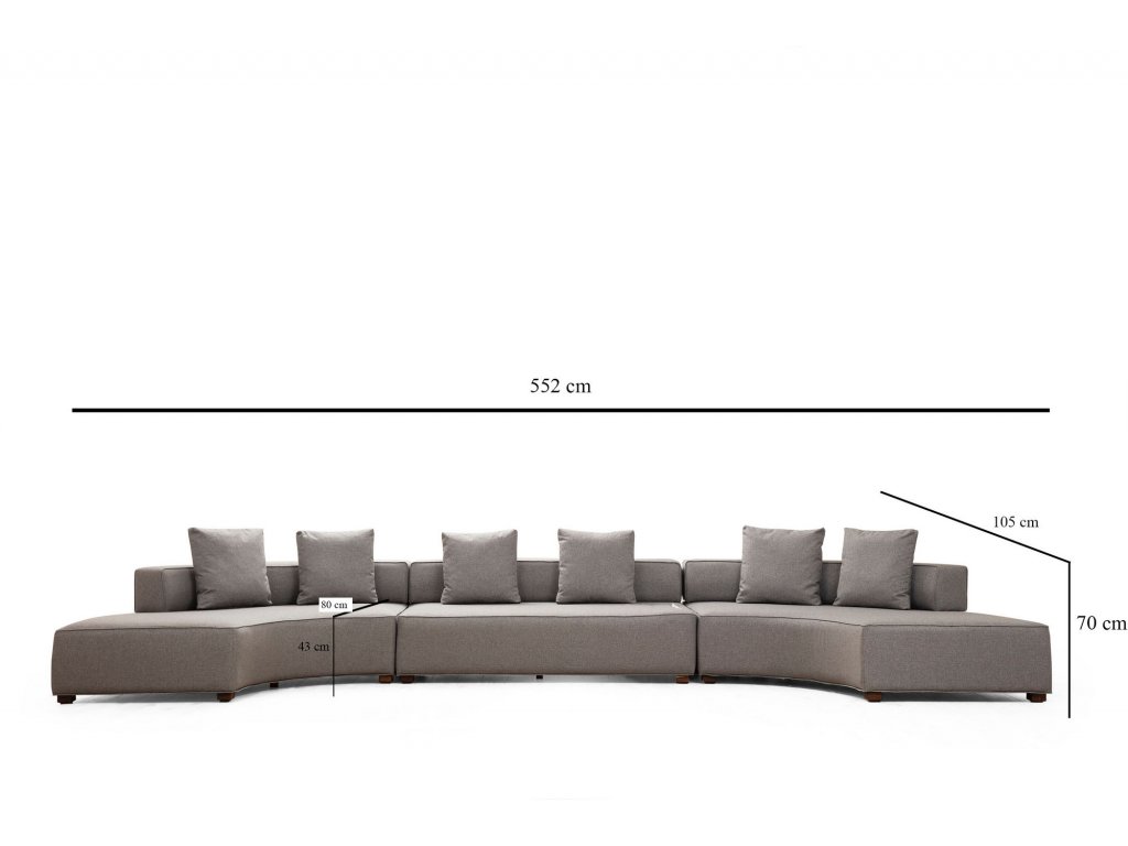 Rozměry: délka: 552cm šířka: 105 cm výška: 70 cm výška sedu: 43 cm , Rozměry polštáře: 50 cm x 50 cm 3 kusy a 45 x 45 cm / 6 kusů
