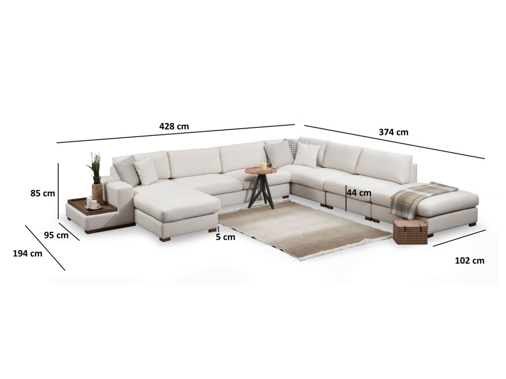 Rozměry: Délka: 428 cm x 374 cm Šířka: 102 cm x 95 cm Výška: 85 cm,