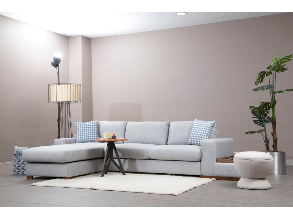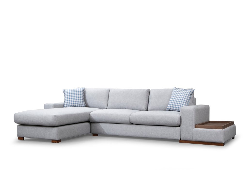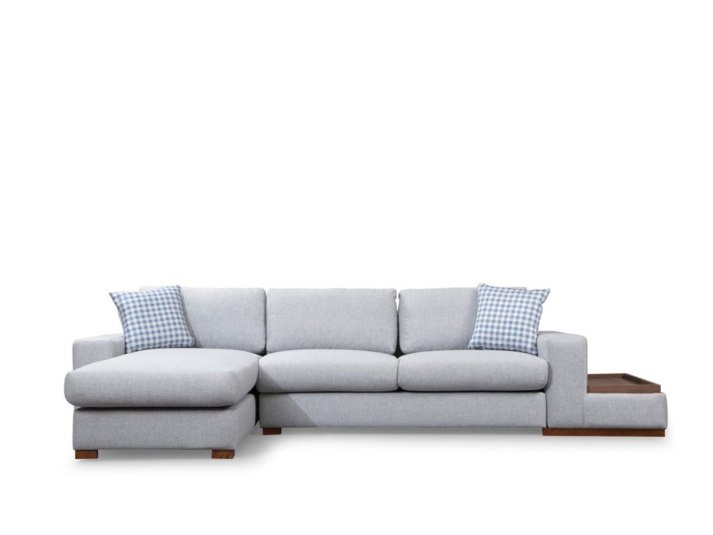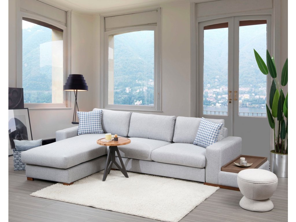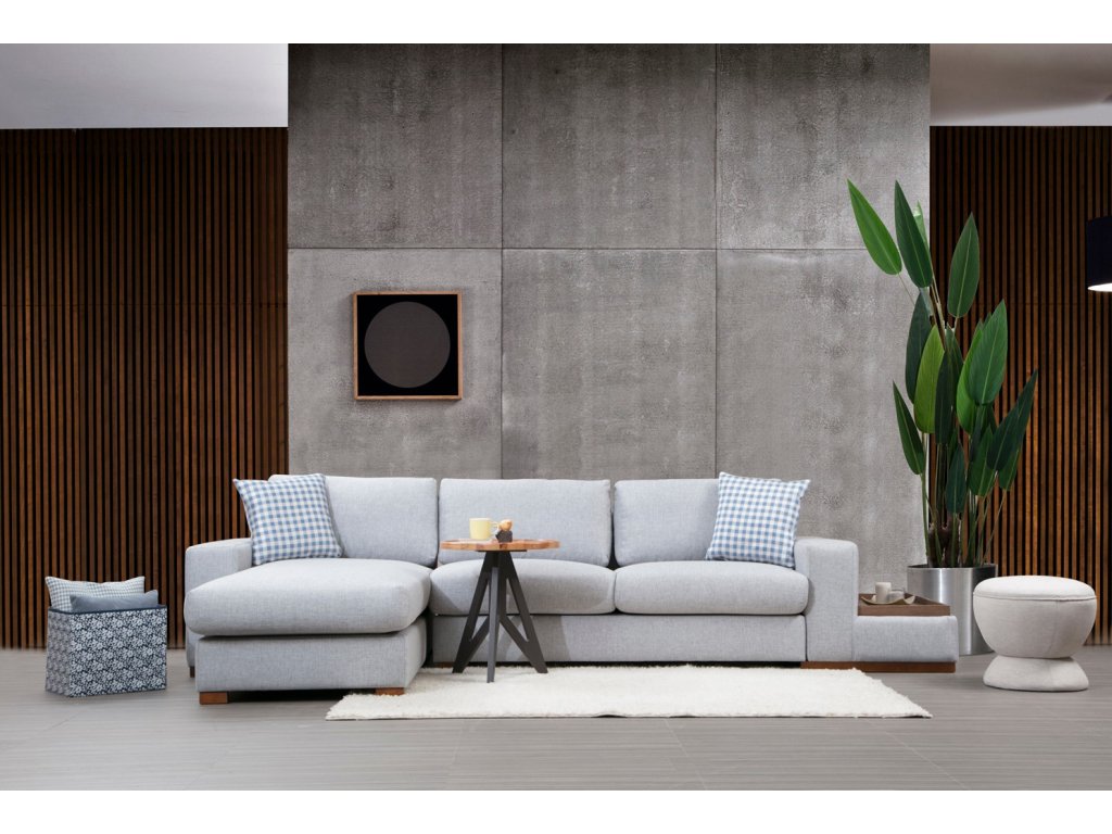Rohová sedací souprava LOOP s praktickým odkládacím stolkem.