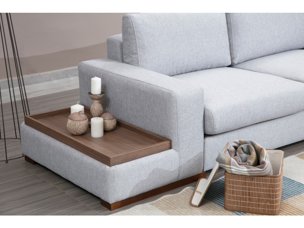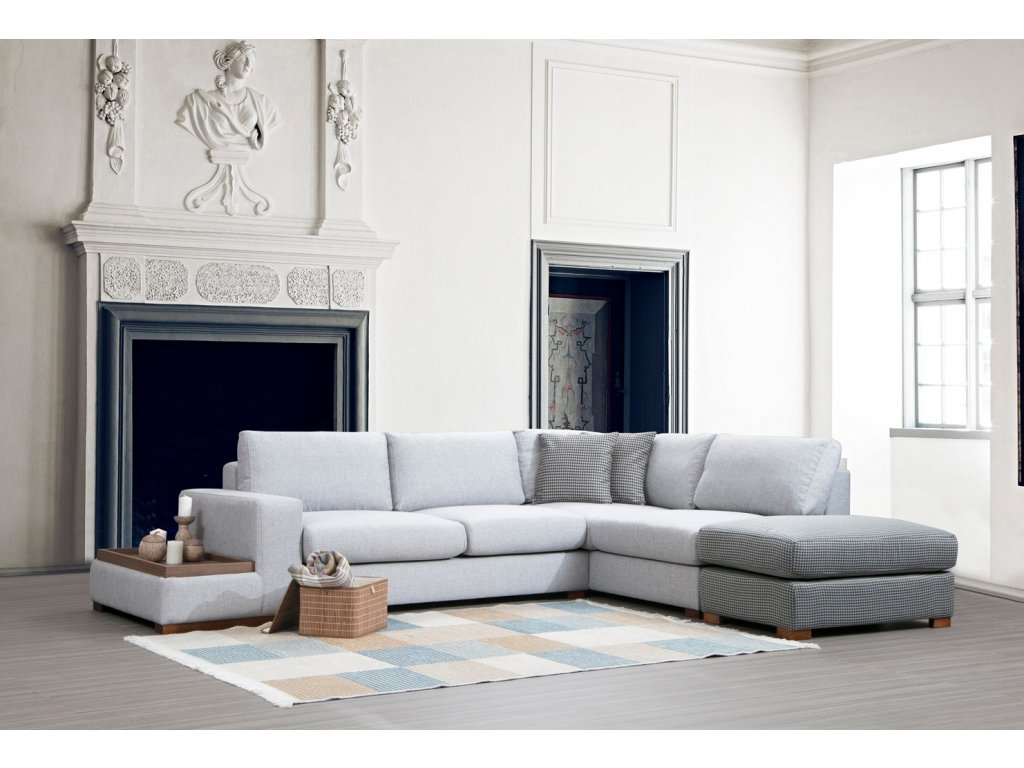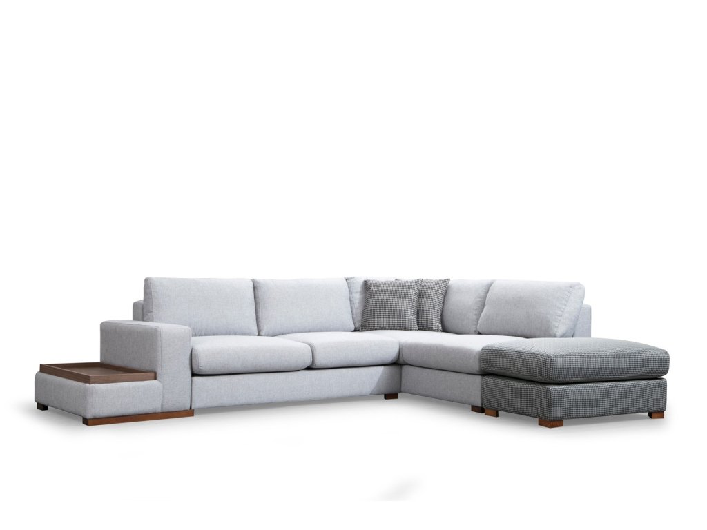 Rohová sedací souprava LOOP s praktickým odkládacím stolkem a pufem.