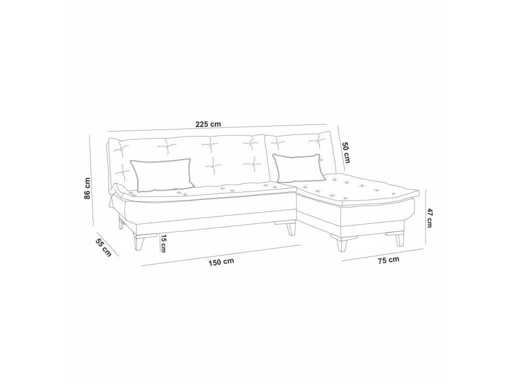 Rozměry: Šířka: 225 cm Výška: 86 cm Hloubka: 85 cm, Výška sedáku: 47 cm Hloubka sedáku: 55 cm, Tloušťka sedáku: 4 cm, Šířka zádového polštáře: 225 cm, Tloušťka zádového polštáře: 4 cm, Výška nohou: 15 cm