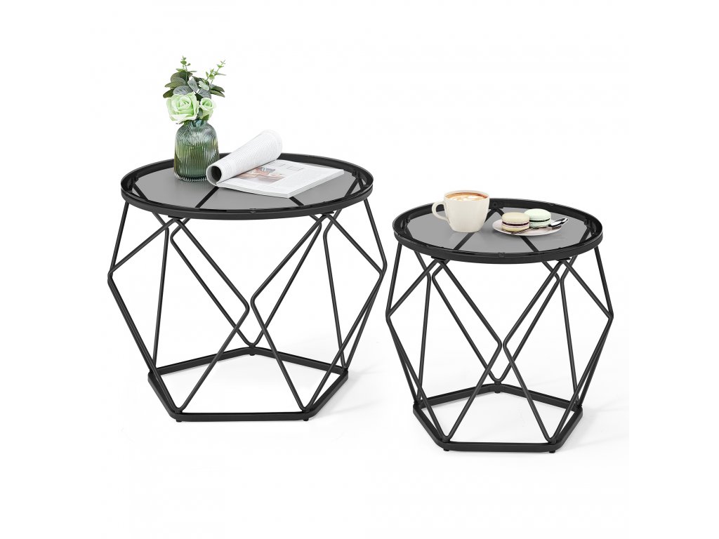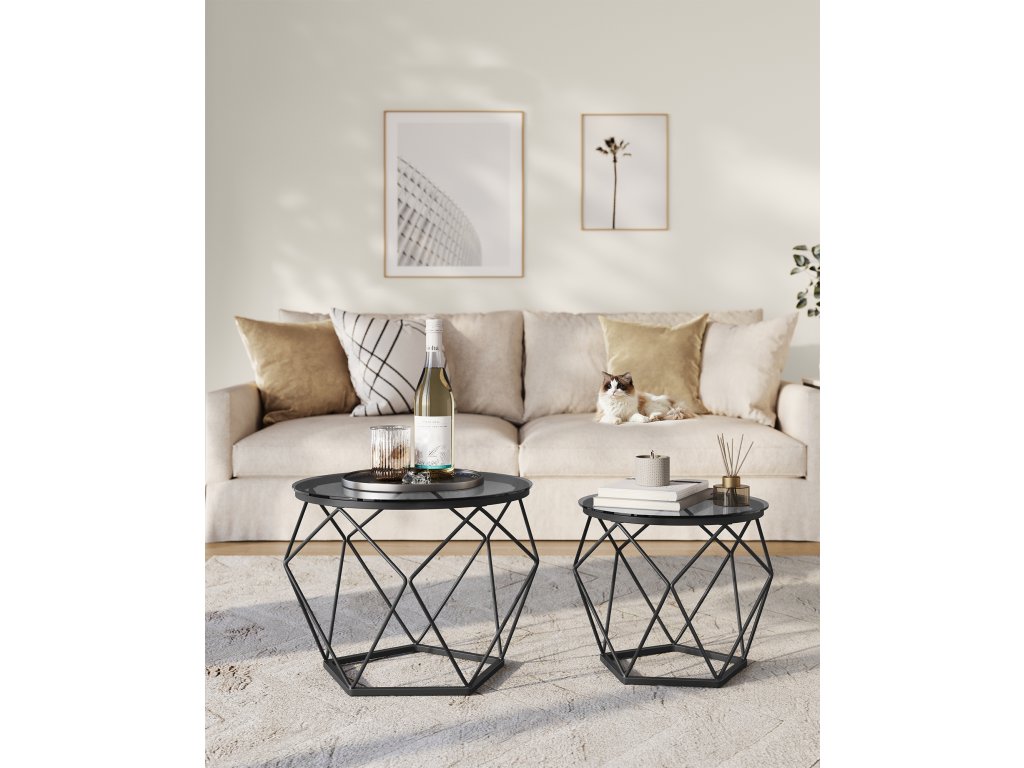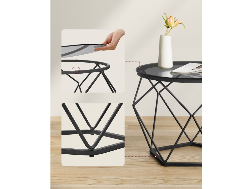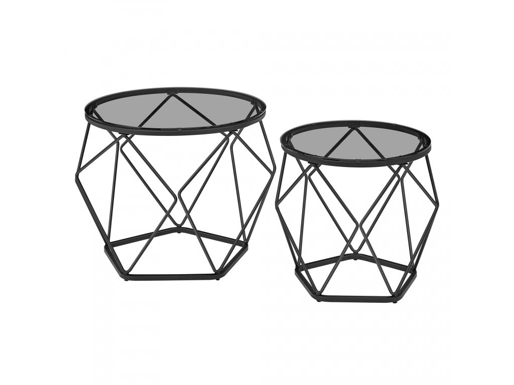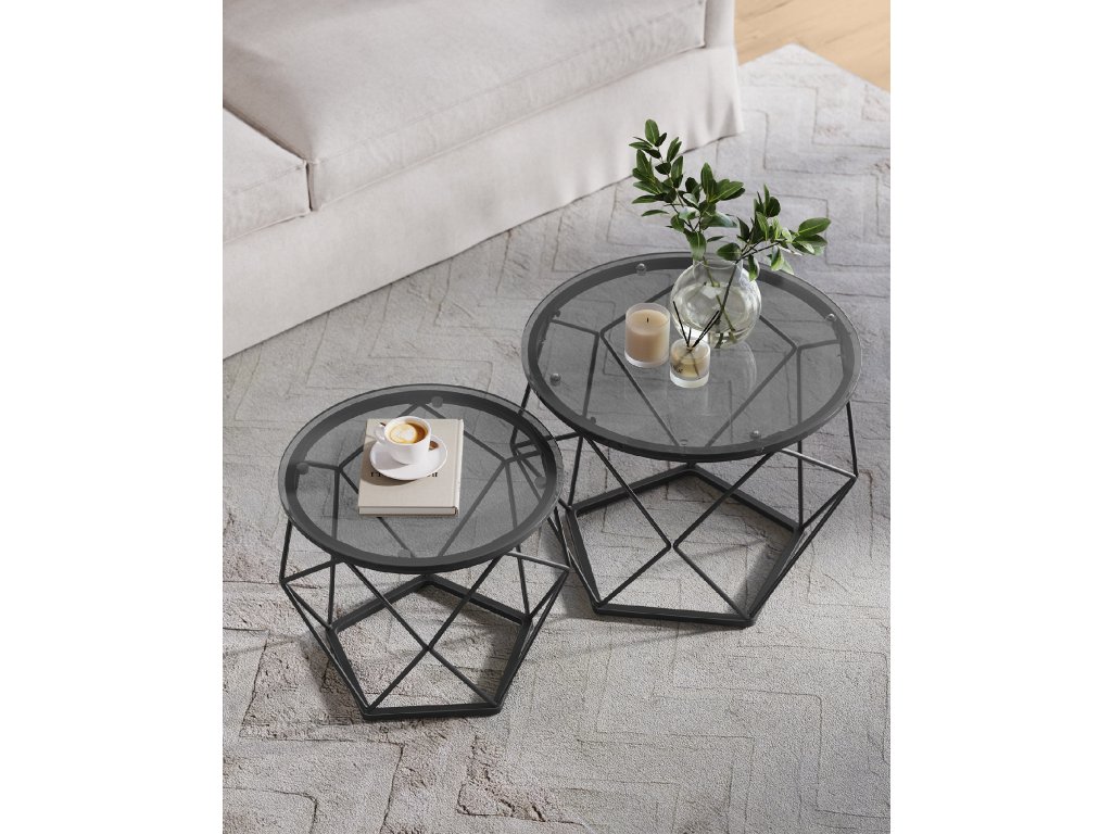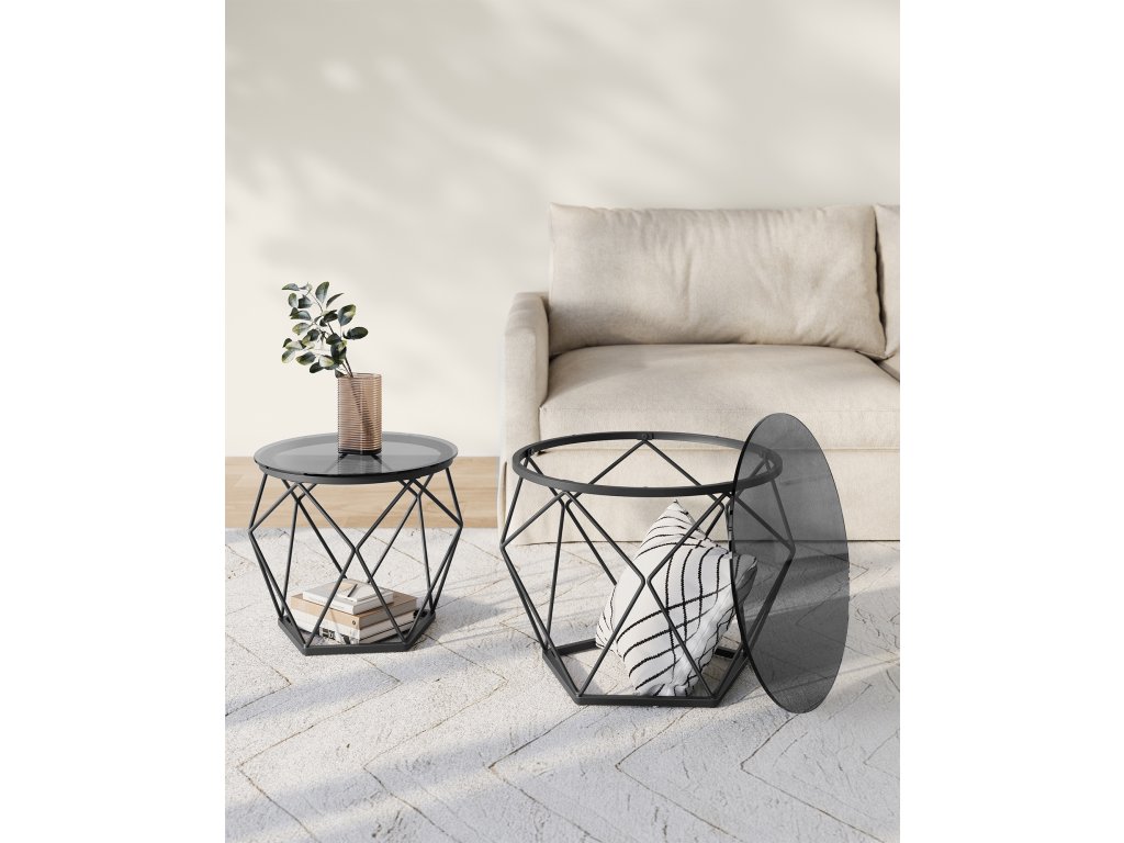 Tato sada stolků vašemu domovu vdechne moderní vzhled. Kouřovými skleněnými deskami a geometrickými rámy z tmavé oceli okouzlí vaše hosty a dodají vašemu prostoru eleganci a svěžest.