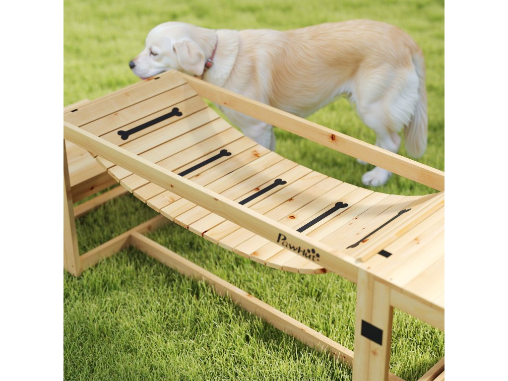 Zlepšete obratnost svého psa s agility sadou PawHut! Sada obsahuje měkký most, odpočinkovou plošinu a schody, které jsou navrženy tak, aby podporovaly různé dovednosti. Je vyrobena z kvalitního smrkového dřeva, je vhodná pro střední až velké psy do 40 kg a díky ní bude každý trénink zábavou.