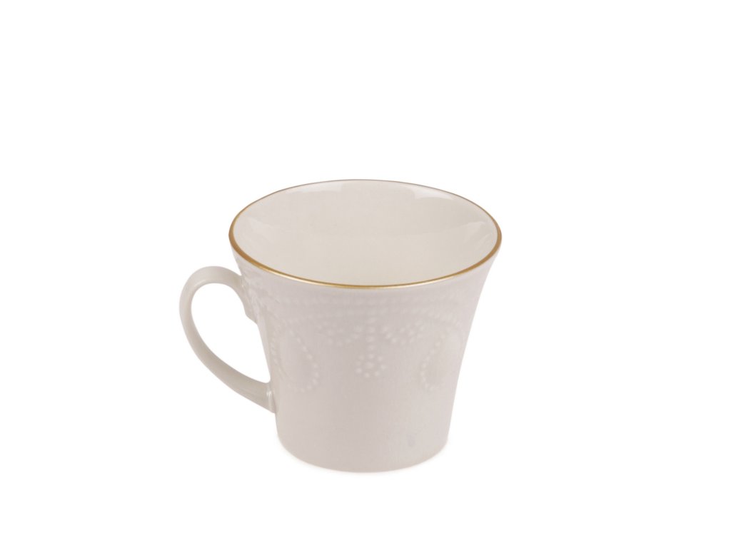 Je vyrobena z porcelánu krémové barvy se zlatým lemováním.