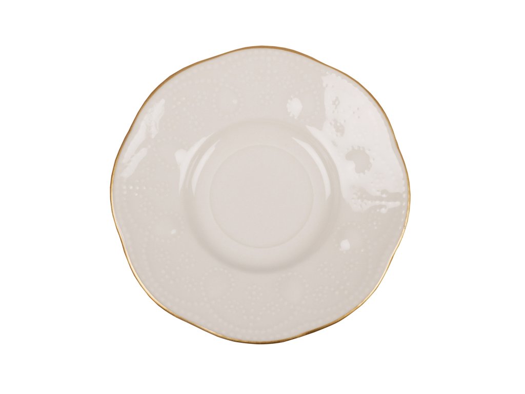 Sada šálků s podšálky je vyrobená v krémové barvě, kterou elegantně doplňuje zlatý lem na okraji každého kousku.