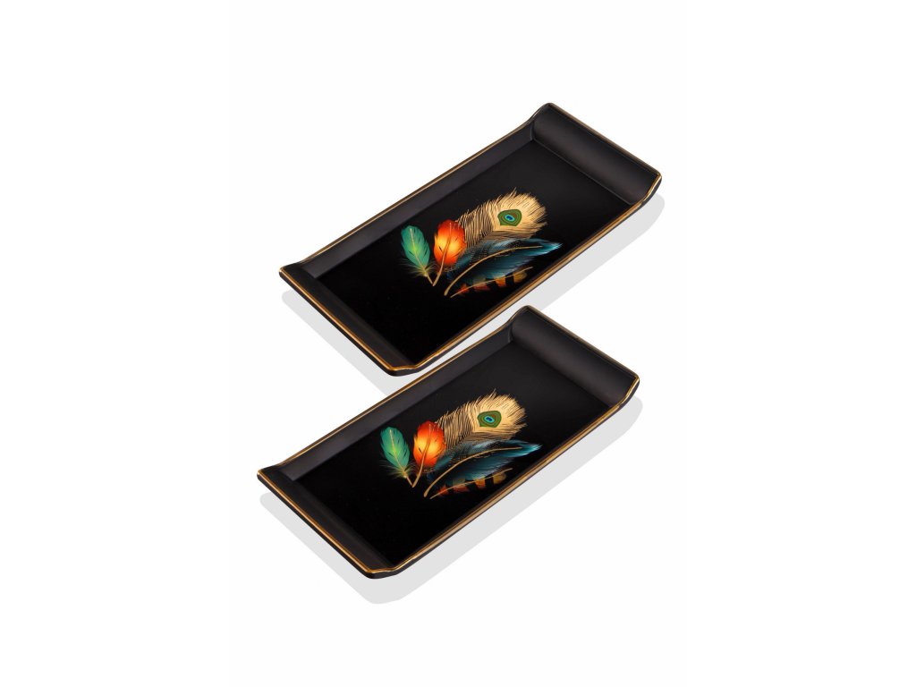 FEATHER je sada dvou obdélníkových plastových talířků s dekorem ptačích per na černém podkladu.