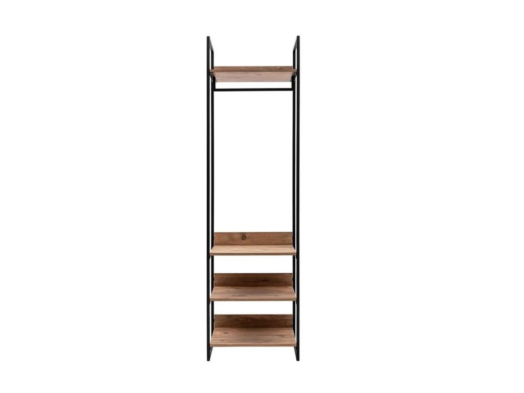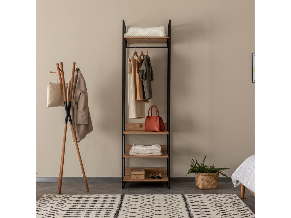 Otevřená skříň nabízí tyč na kabáty, ve spodní části tři police na oděvy nebo obuv a ve vrchní části jednu.