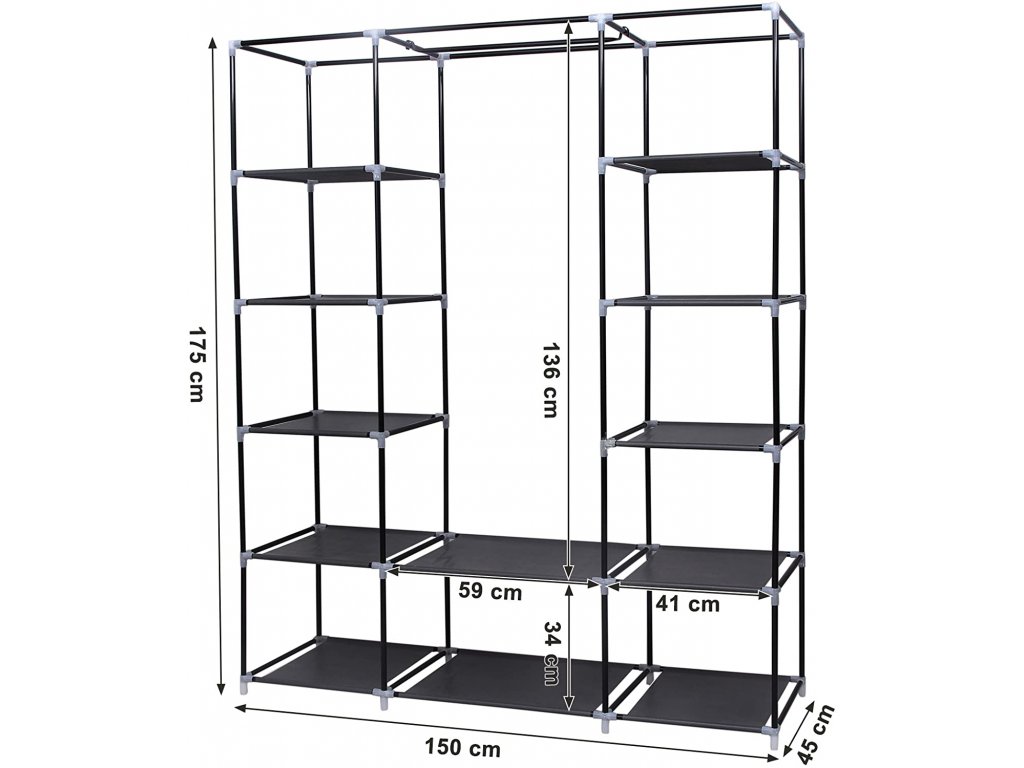 Rozměr 150 x 45 x 175 cm s tyčí pro zavěšení na oblečení a 12 odkládacími policemi vám nabízí dostatek místa pro kabáty, šaty, ložní prádlo, dětské hračky, skládané oblečení a další