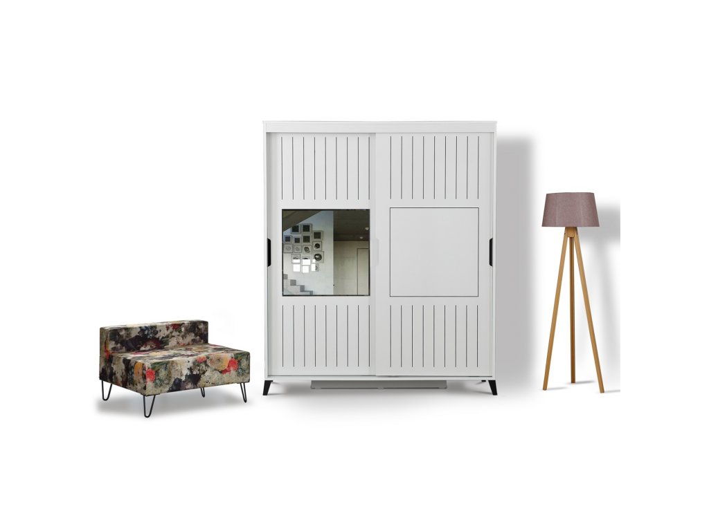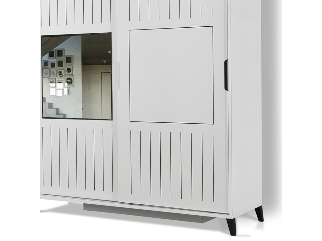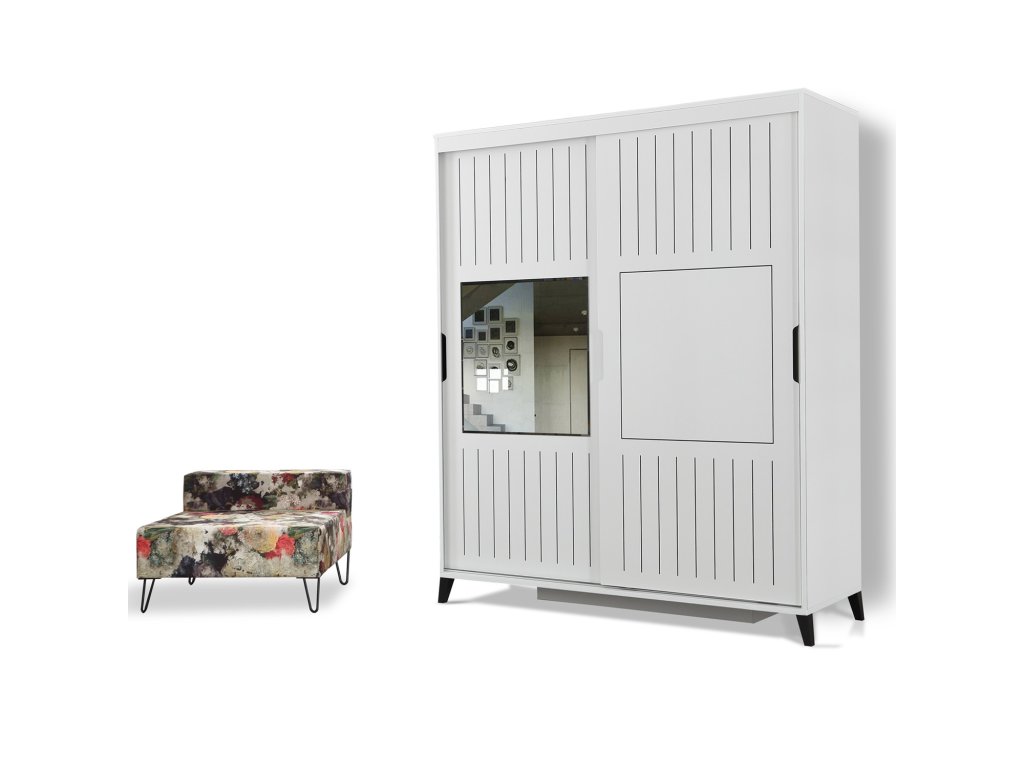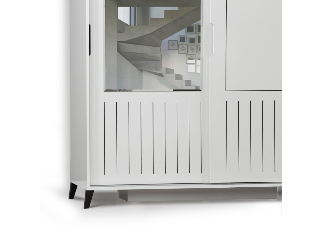 Dveře skříně jsou posuvné s jemnými vertikálními proužky, na dveřích je obdélníkové zrcadlo.