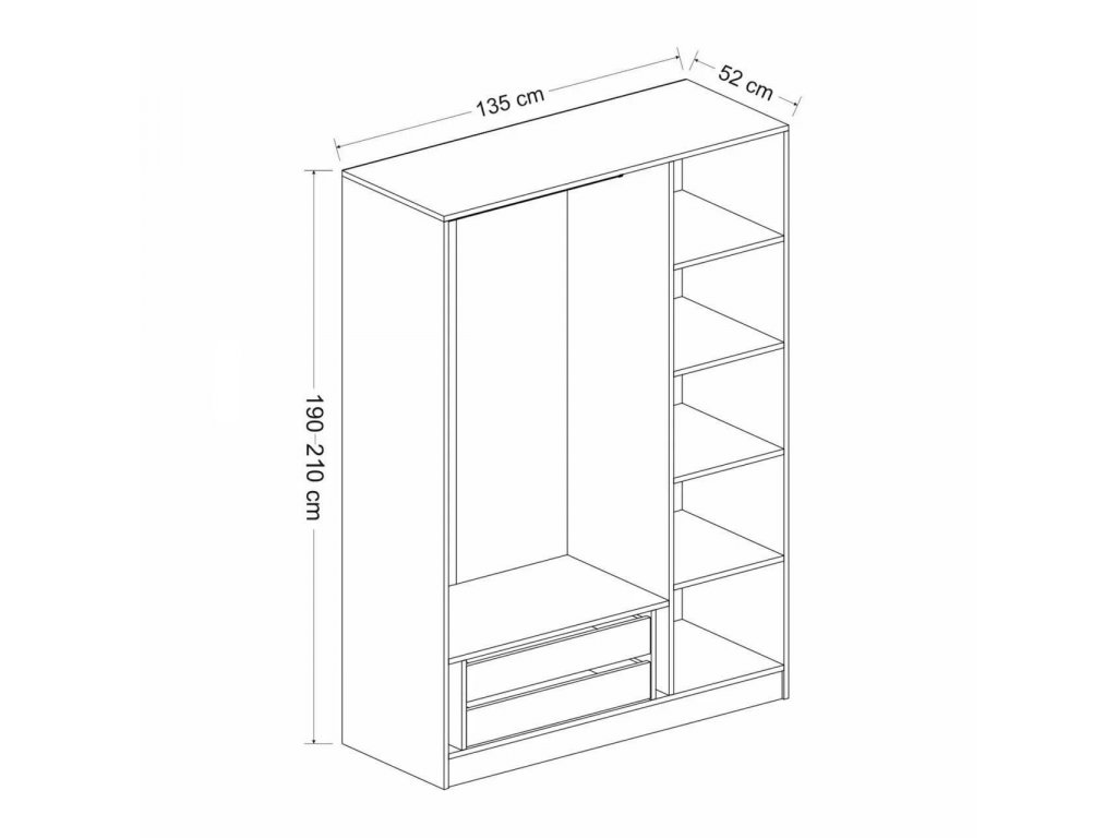 Díky šířce 135 cm, výšce 210 cm a hloubce 52 cm nabízí tato šatní skříň velkorysý úložný prostor, který pojme všechny vaše věci. Od oblečení a doplňků až po lůžkoviny a další věci - konečně se můžete rozloučit s nepořádkem a užívat si přehledné ložnice.