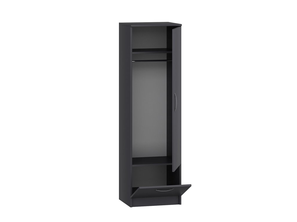 Šatní skříň SANTA nabízí ve spodní části jednu s výklopnými dvířky otevíravou skříňku a nad ní za společnými dveřmi jeden regál a konzoli pro zavěšení oděvů.
