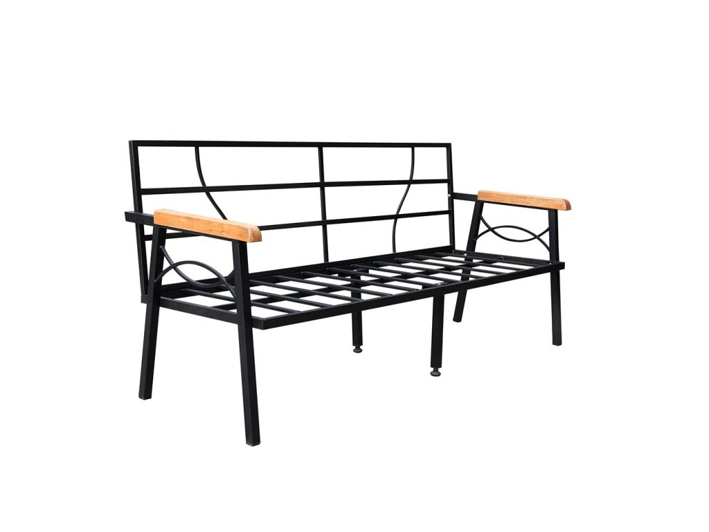 Je vyrobena z černých kovových rámů a šedého polstrování.