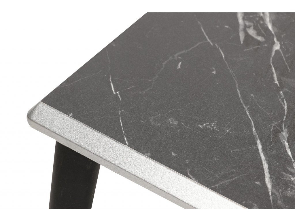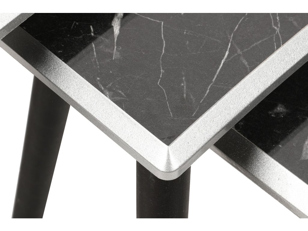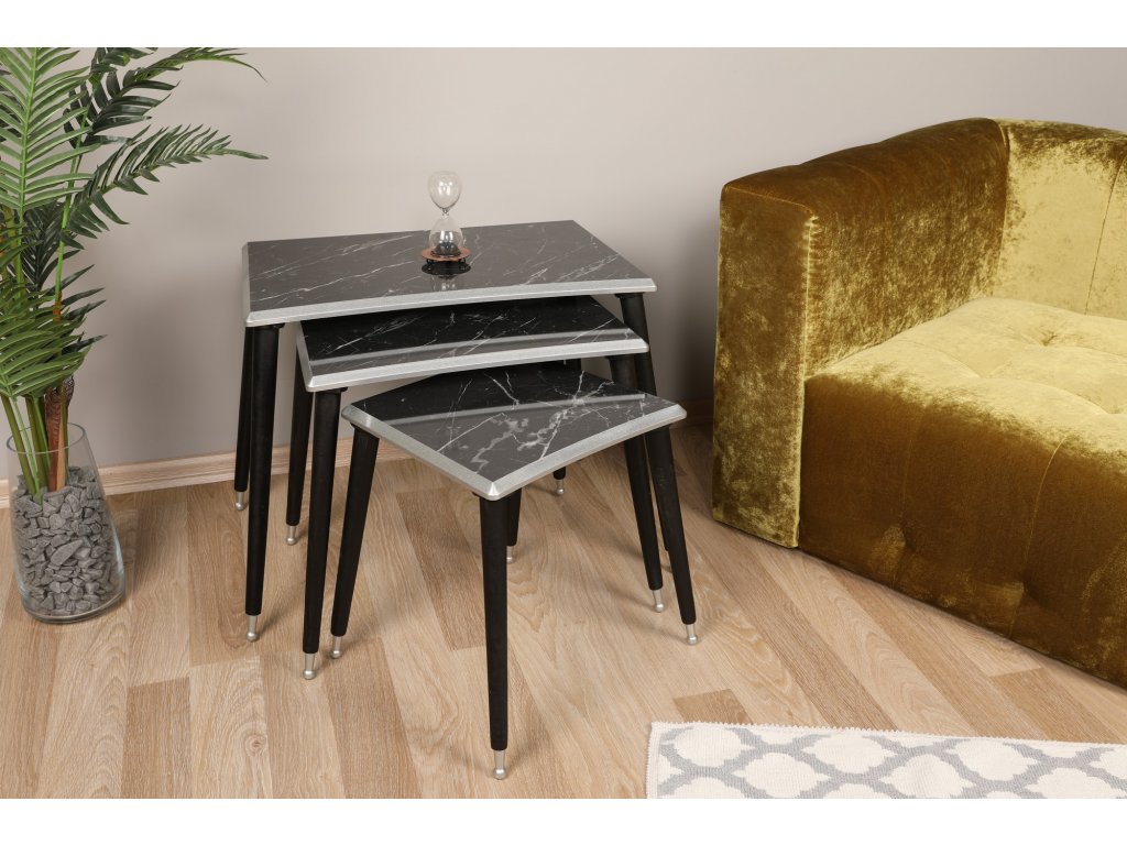 Set konferenčních stolků ARWTON představuje tři stolky s obdélníkovými šedým lemem orámovanými deskami v barvách černého mramoru, jež jsou usazené vždy na čtyřech úzkých černých nožkách se stříbrnými patkami.