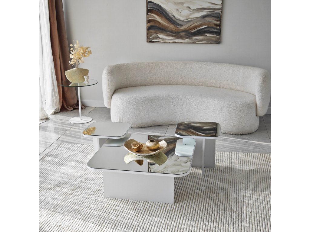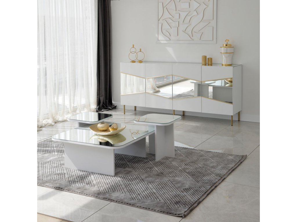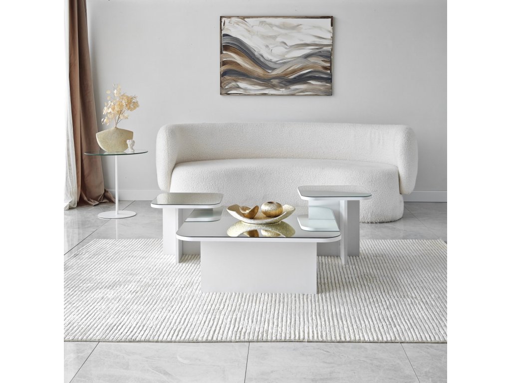 Sada konferenčních stolků má úžasnou bílou barvu, která dodá vašemu obytnému prostoru nádech sofistikovanosti a klidu. Neutrální tón bez námahy doplní jakékoliv barevné schéma, což z něj činí univerzální volbu pro váš domov.