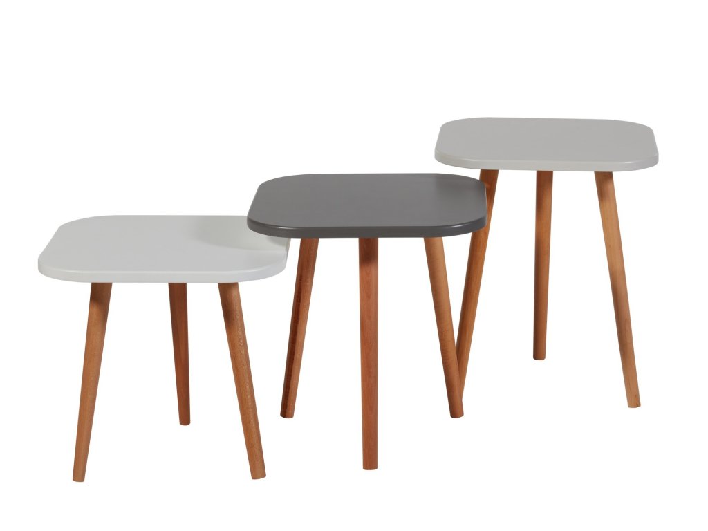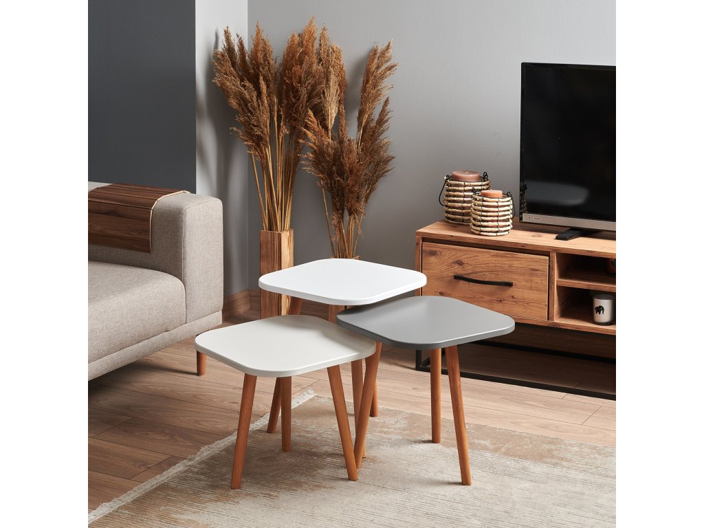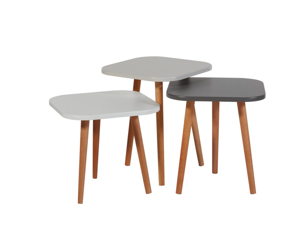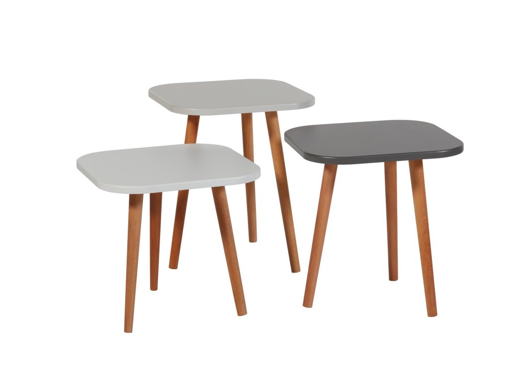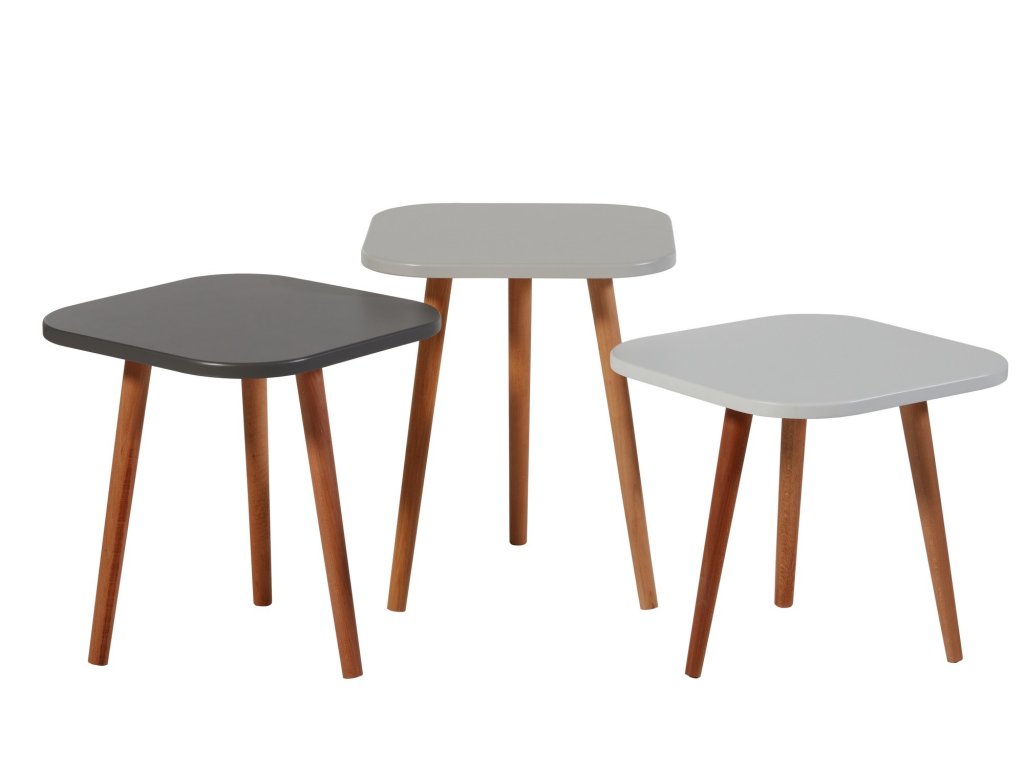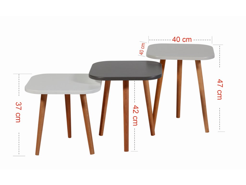 Set konferenčních stolků TUVALLE představuje tři stolky s různými čtvercovými deskami v barvách antracitové, šedé a v dekoru dub, jež jsou usazené vždy na třech bukových nožkách.