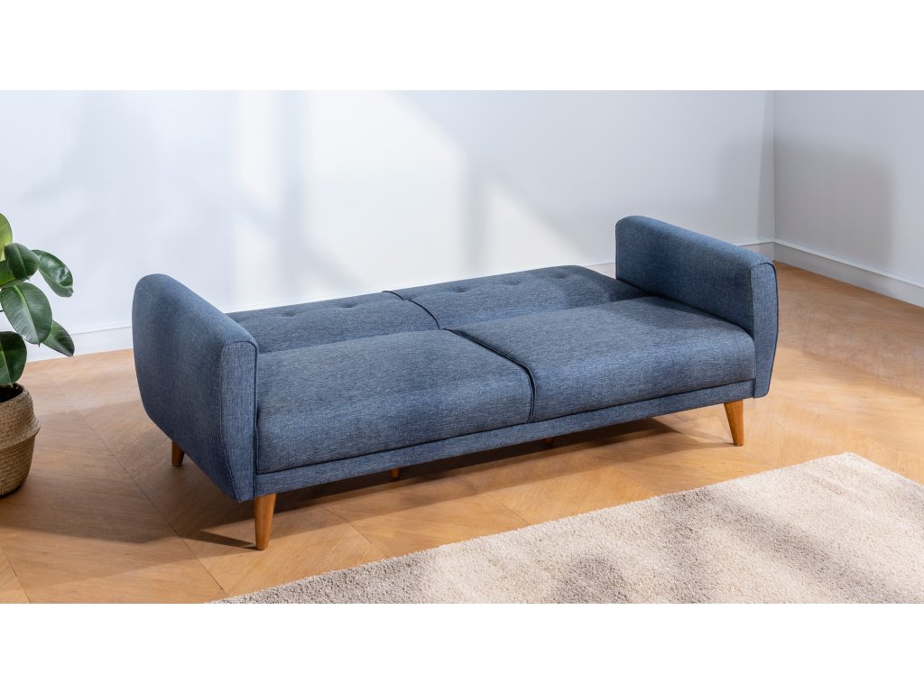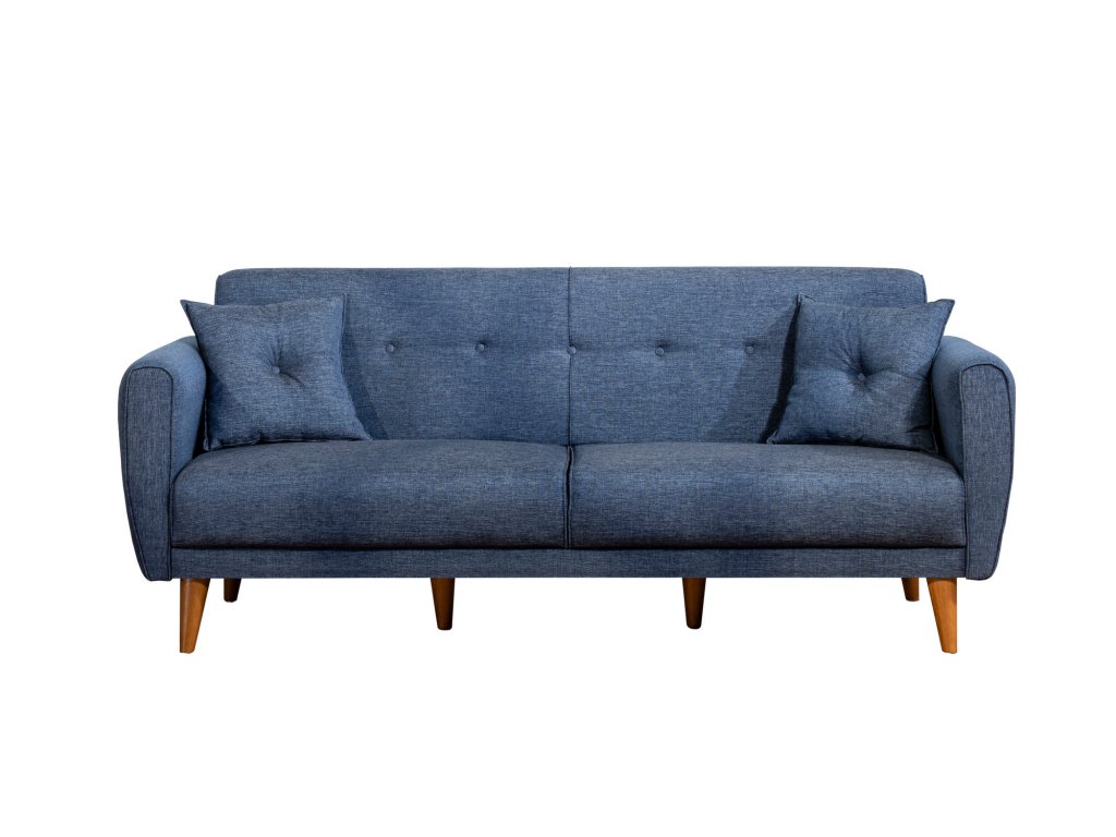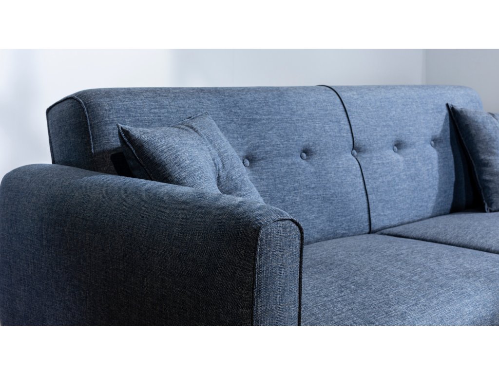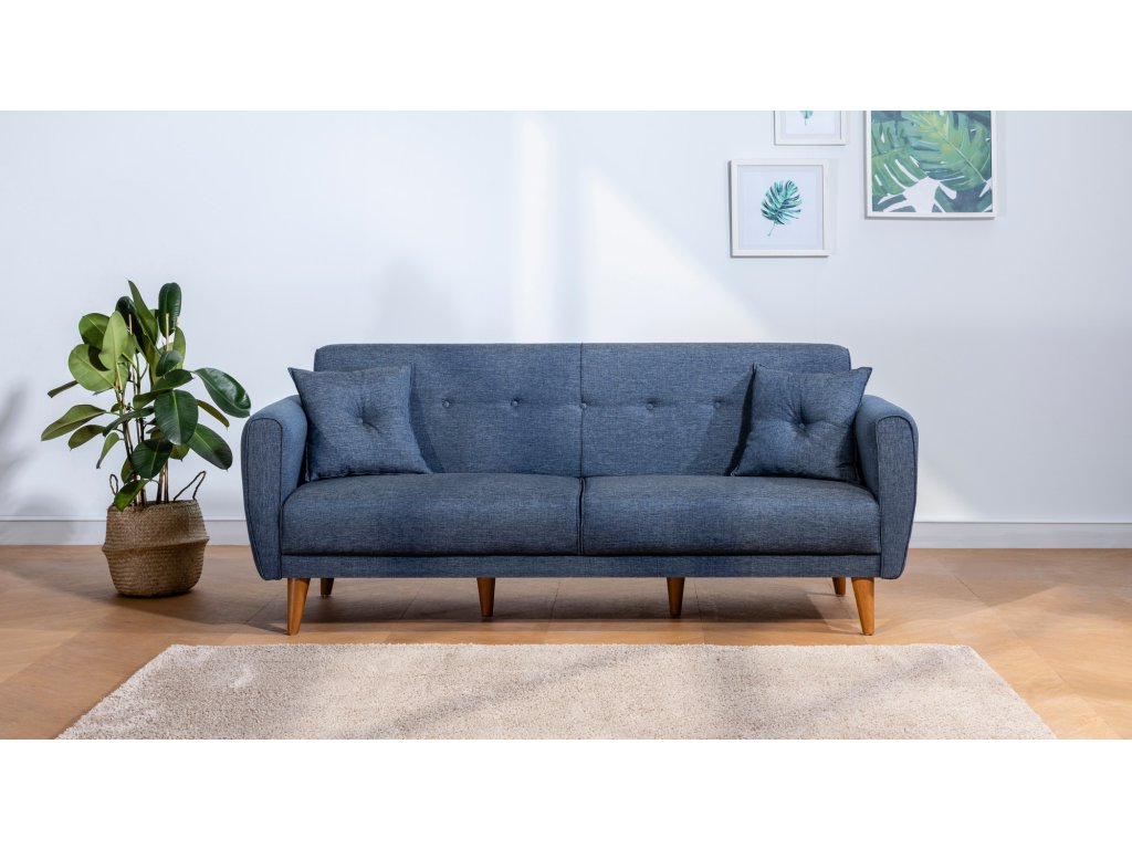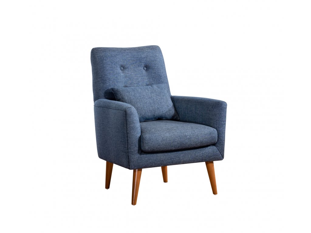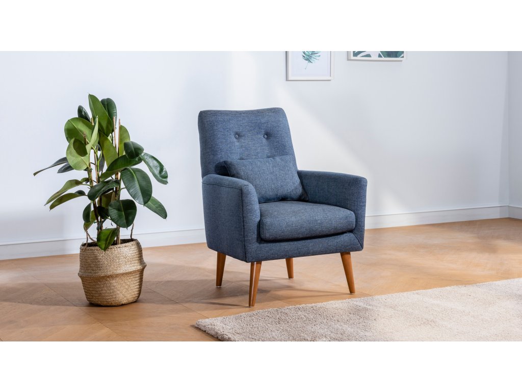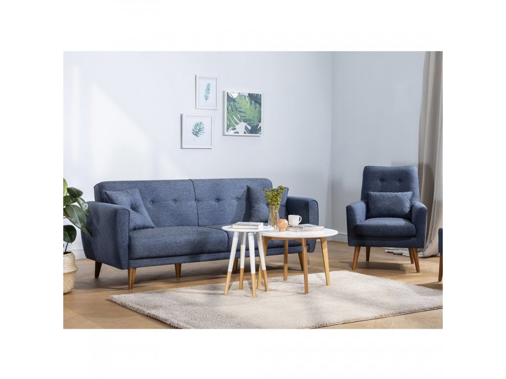 Pohovka praktické velikosti pro menší obývací pokoje doplněná o křeslo ze stejné kolekce zaujme svými dřevěnými nožkami, pohodlným polstrováním a extra polštáři.