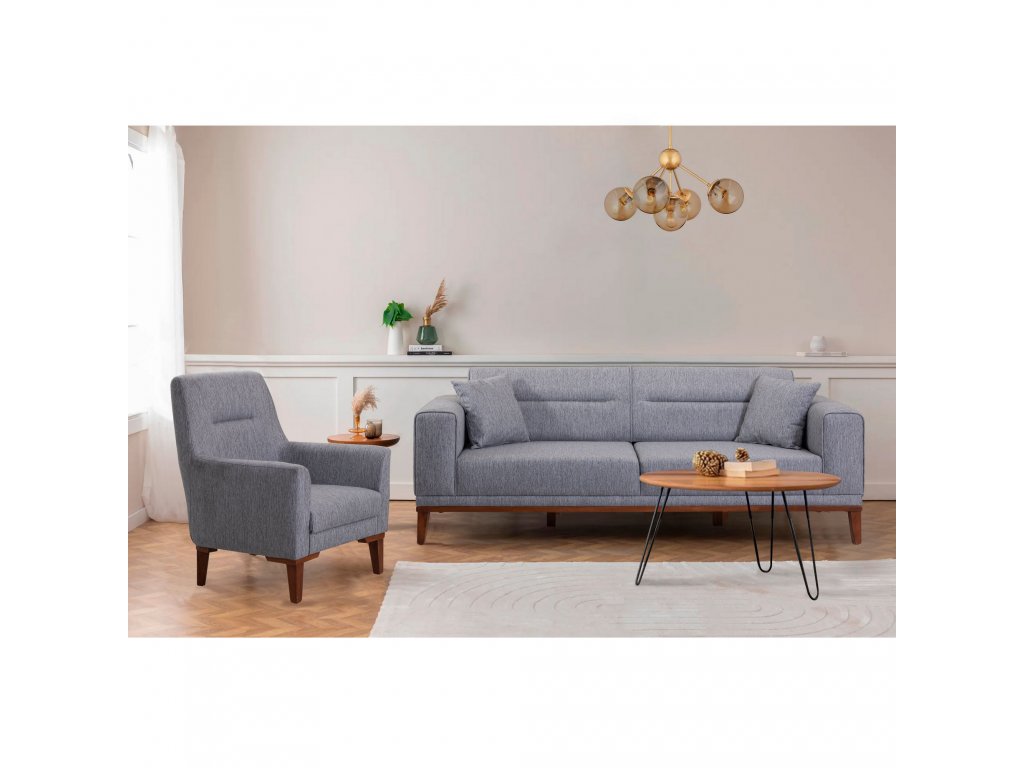 Pohovka i křeslo mají dřevěné nohy.