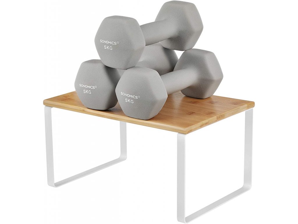 Police jsou vyrobeny z vysoce odolného bambusu a pevného kovu, každá unese až 15 kg, stačí na ni položit nádobí na kávu nebo dózy s kořením a budou vždy stát stabilně