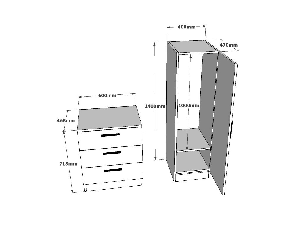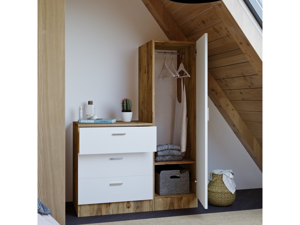 Skříňka CC6 se skládá ze 3 prostorných šuplíků a jedné skříňky s tyčí na zavěšení oblečení a dvěma poličkami.