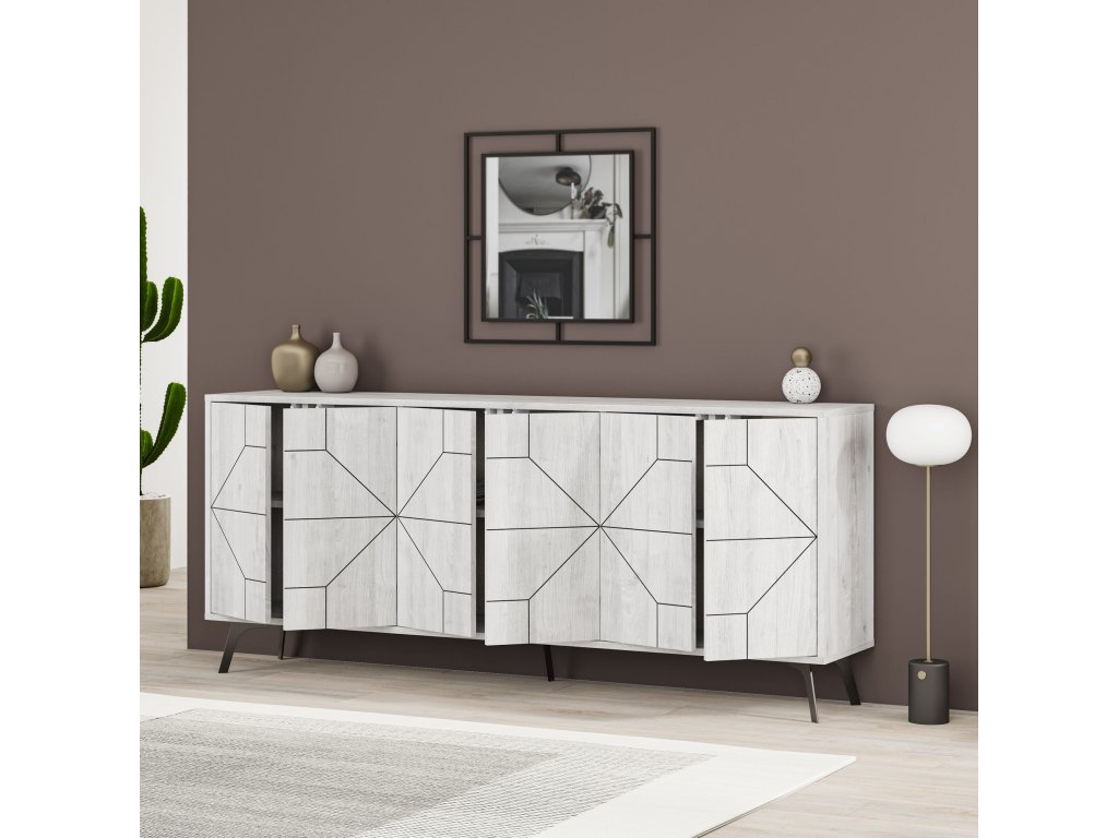 Víceúčelová skříňka DUNE je vyrobená v dekoru bílého mramoru a její tři páry dvířek mají na sobě černé určité linie.