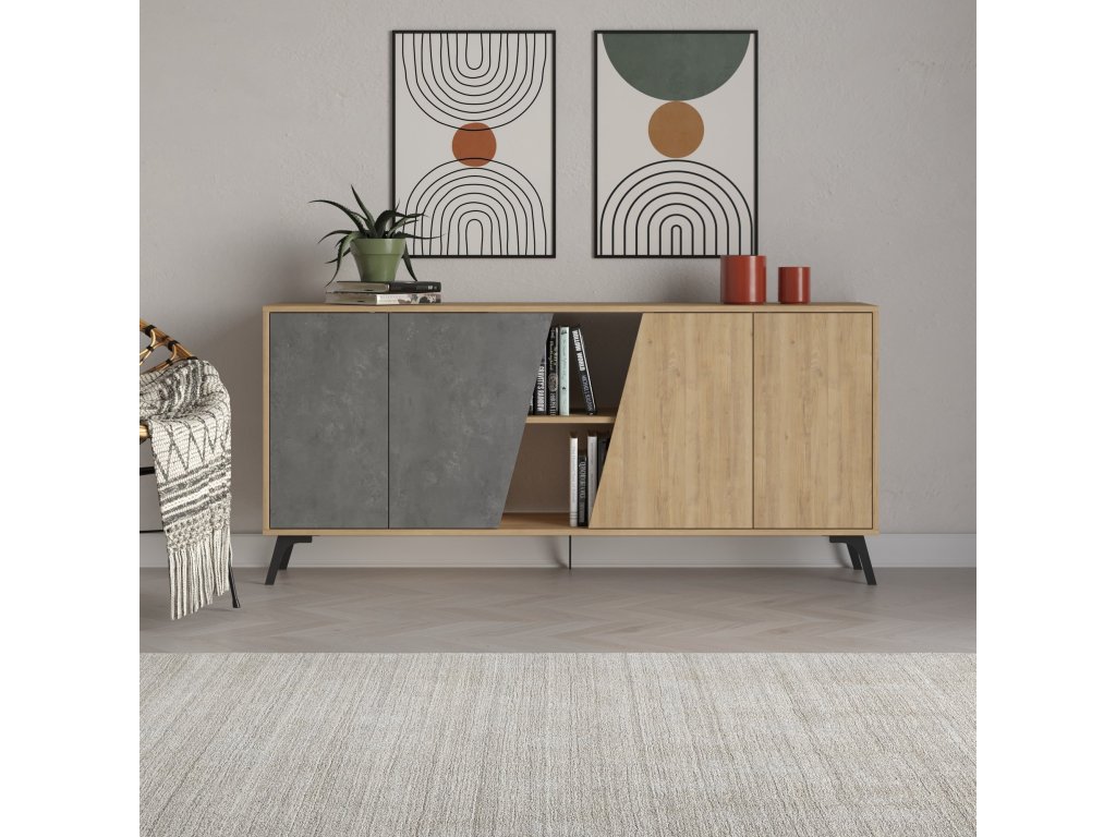 Skříňka FIONE je vyrobená v kombinaci dekoru dub a šedé barvy a je vybavena dvěma páry dvířek, přičemž je uprostřed šikmá mezera, která nechává nahlédnout dovnitř.