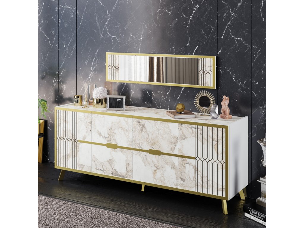 Nožičky a linie komody jsou zlaté, komoda se bude hodit do honosně zdobených prostor.