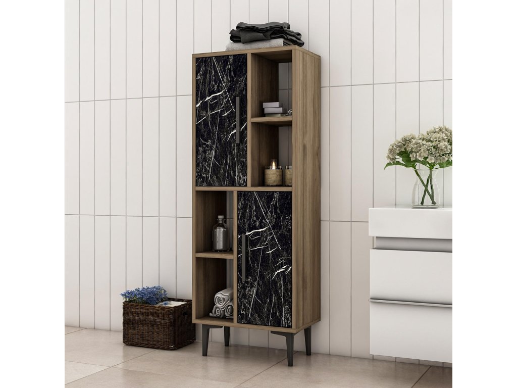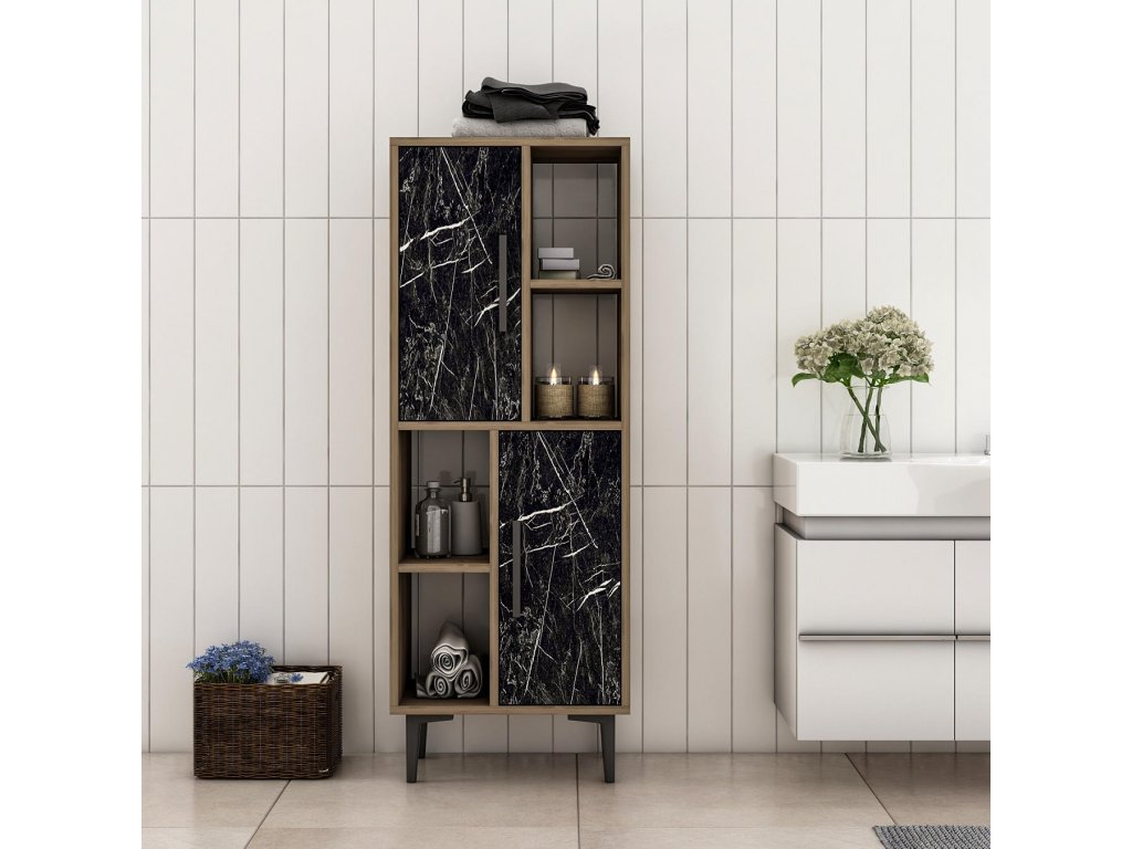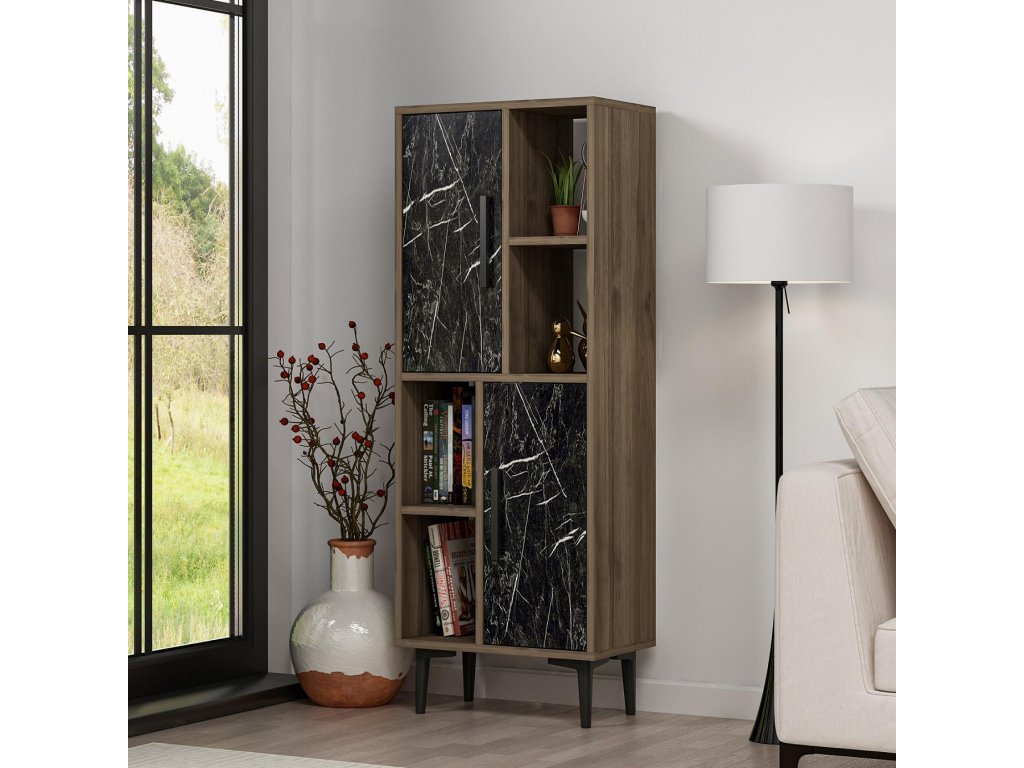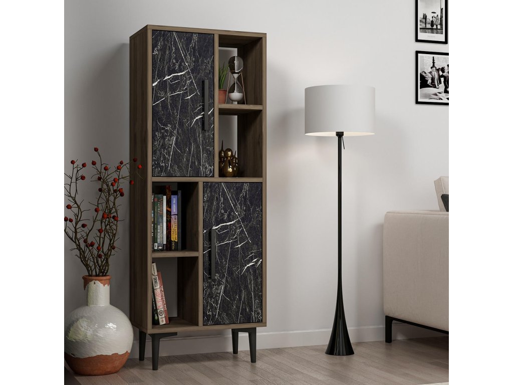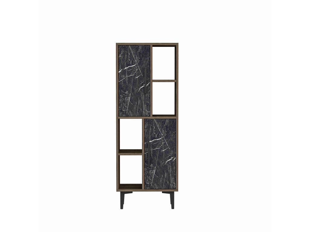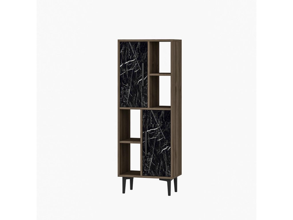 Skříňka LENI je tvořená osmi v dekoru ořech vyrobenými regály a dva páry diagonálně ložené jsou vybaveny dvířky v dekoru černý mramor s vertikálními madly.