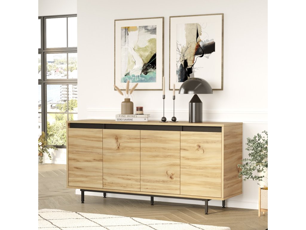 Na černých kovových nožkách stojící skříňka LV30 je vyrobená v dekoru dub a nabízí uvnitř středový větší a postranní dva menší úložné prostory opatřené čtvero dvířky bez úchytů s černou zarážkou.