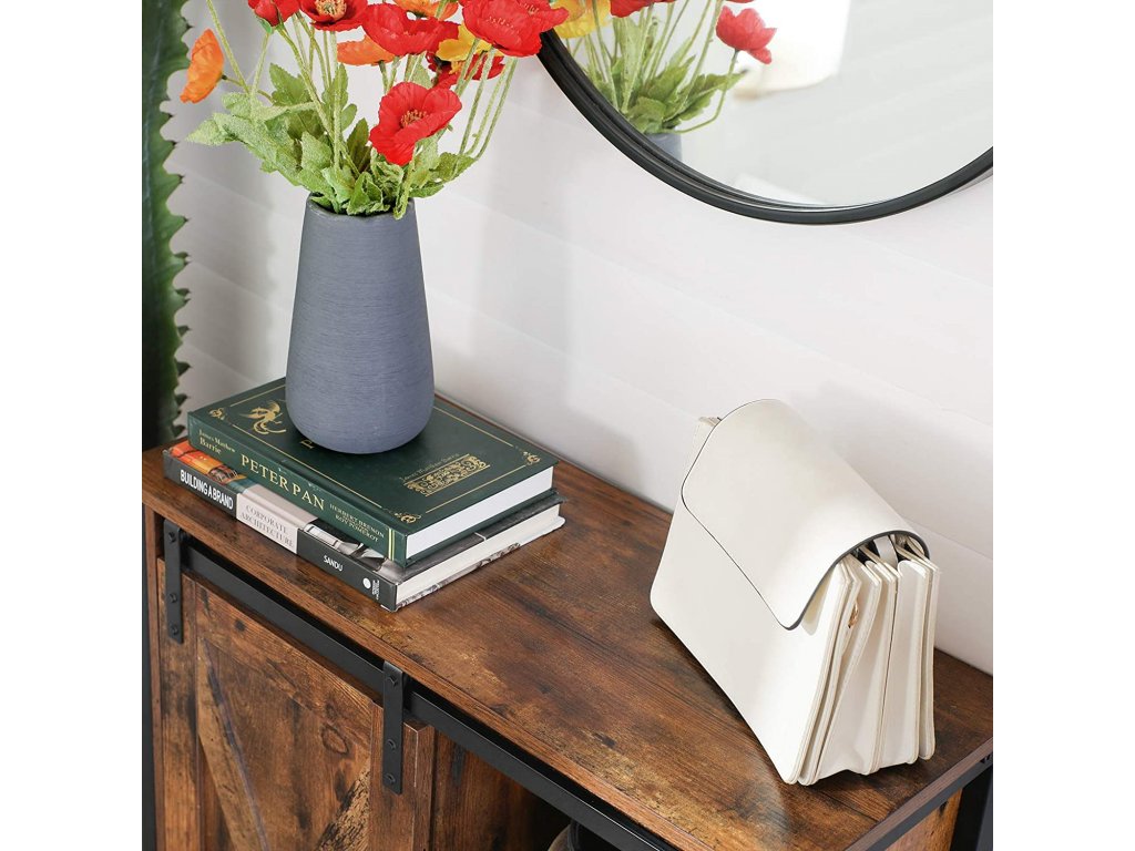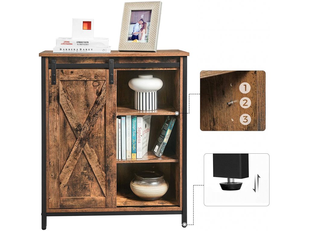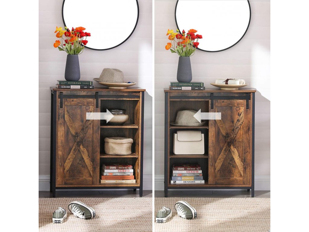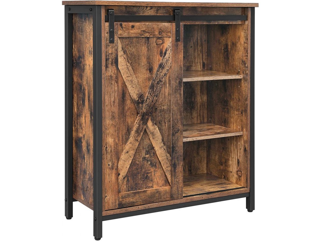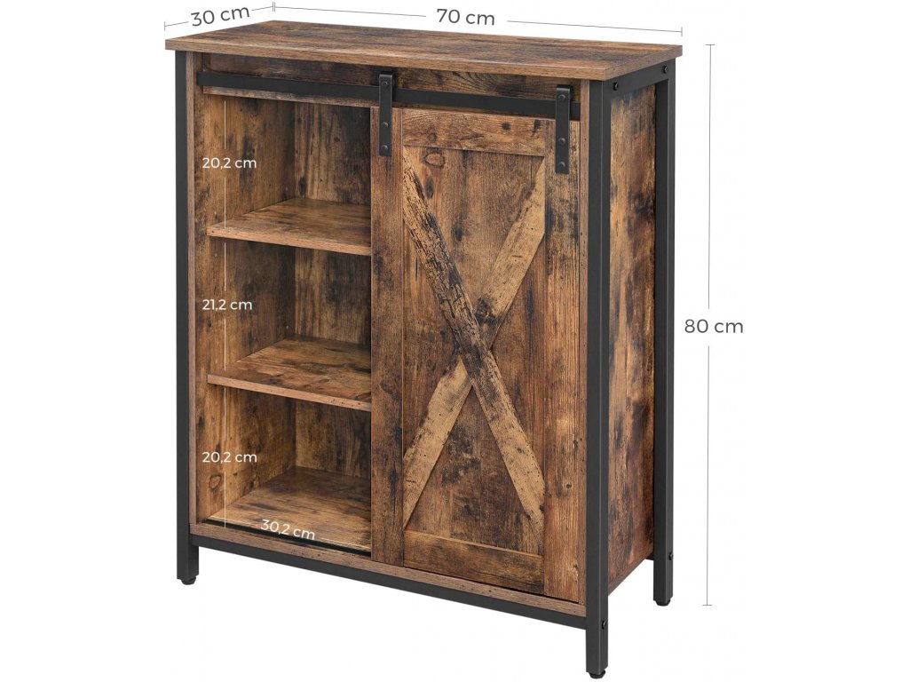 Rustikální dřevěná skříňka se třemi policemi a posuvnými dvířky s kladkovým pojezdem kombinuje otevřený regál s uzavíratelnou skříňkou.