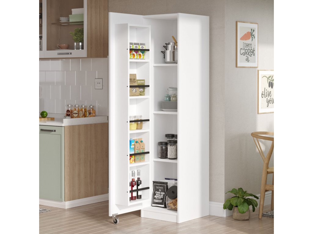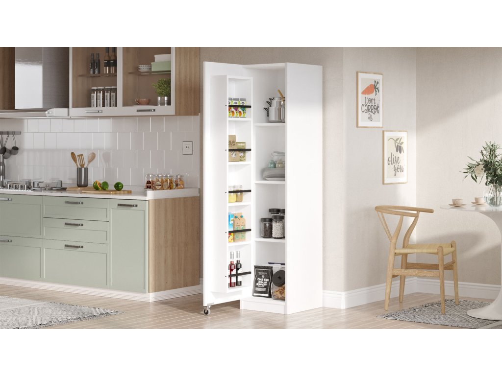 Skříňka má 4 poličky, zavírací dvířka mají stylově řešený úložný prostor v podobě pěti polic kam postavíte mléko, olej aj.