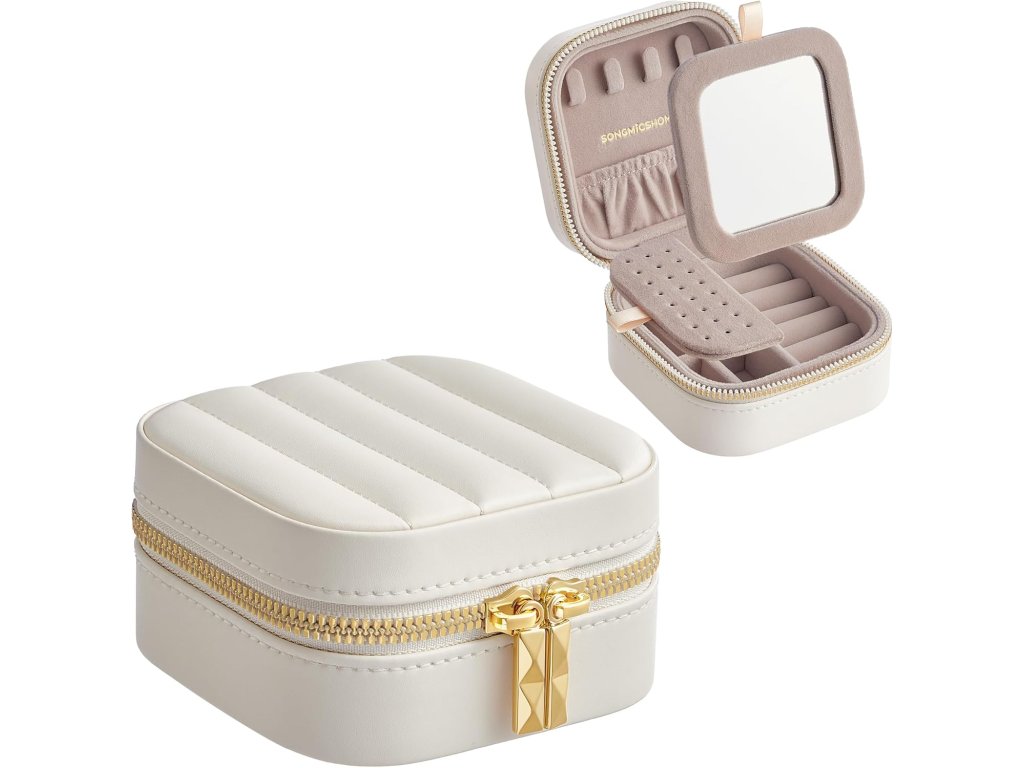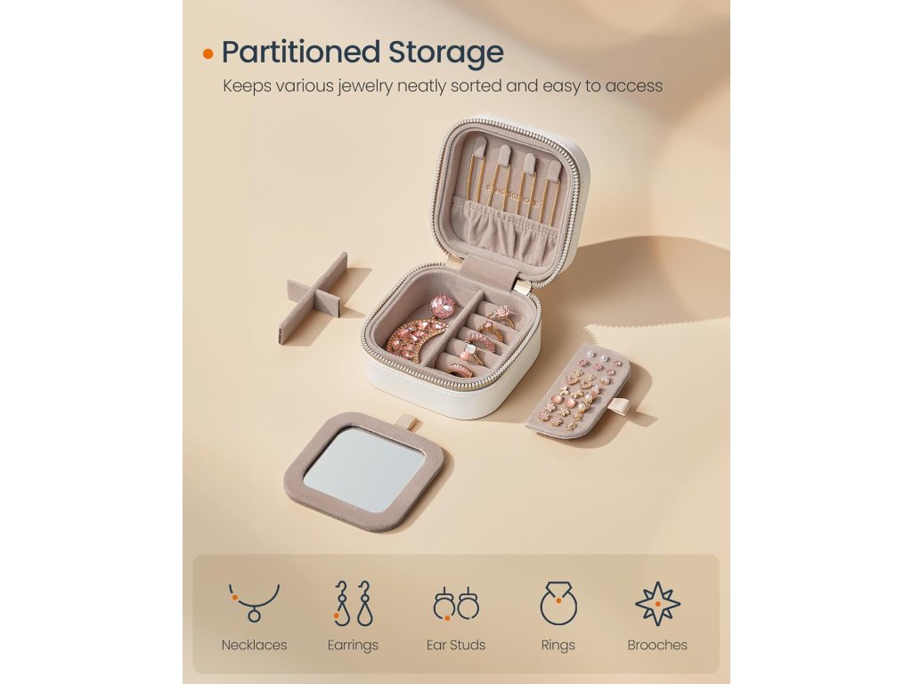 S touto malou šperkovnicí o elegantních rozměrech 10,5 x 10,5 x 6 cm si můžete svůj styl vzít na cesty - je ideální do každé tašky nebo zavazadla. Součástí je praktické zrcátko pro úpravu make-upu a hladké zipy pro snadný přístup.