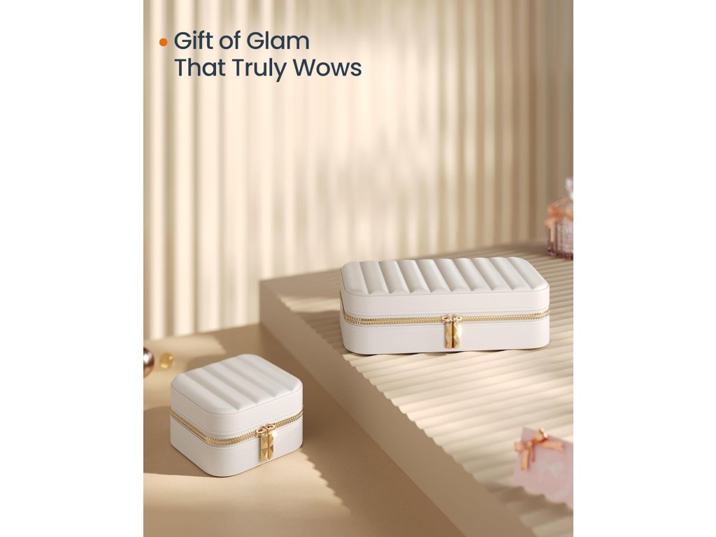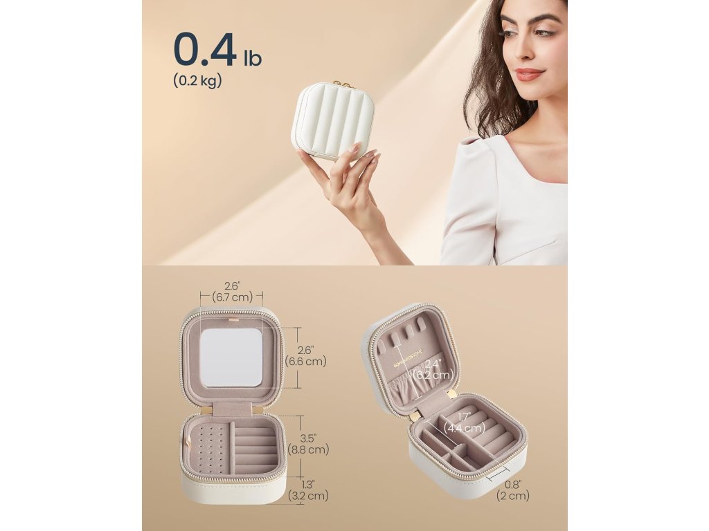 Díky nastavitelným přepážkám, přihrádkám na prsteny, vyhrazené části na náhrdelníky a 2 vyjímatelným deskám na náušnice vám tento malý kufřík na šperky zajistí, že vše dorazí tak hezky, jak jste si to zabalili - žádné zamotání, uzlíky nebo oděrky, a to ani během dlouhých cest.