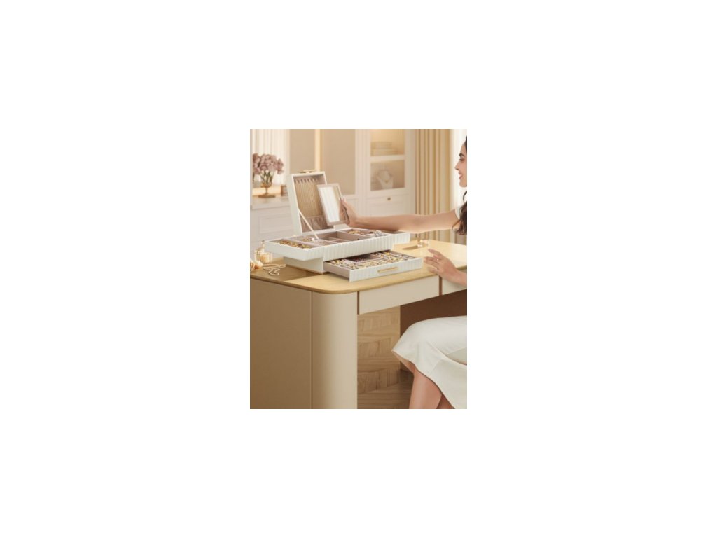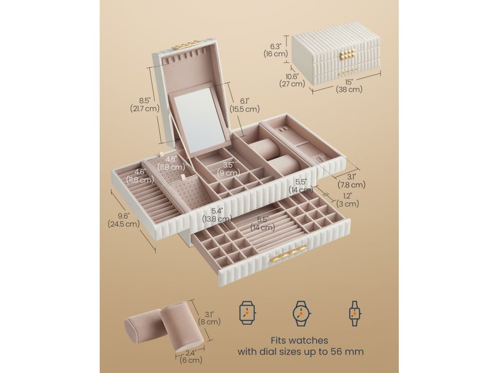 Víko třípatrové šperkovnice se pyšní prostorem pro náhrdelníky až na 10 kusů, zatímco horní přihrádka a 2 zásuvky mají rozdělené přihrádky, které zajistí, že vaše náušnice, prsteny a náramky budou přehledně uspořádané a nezamotané.