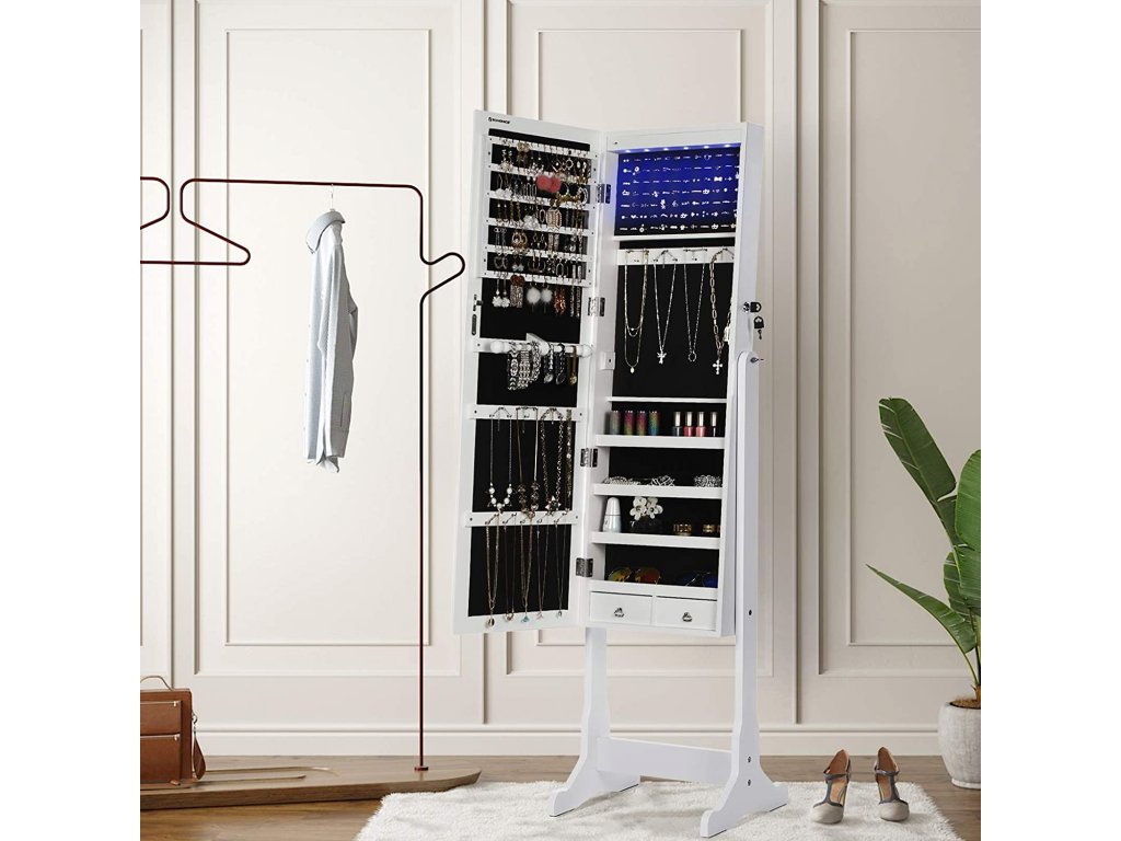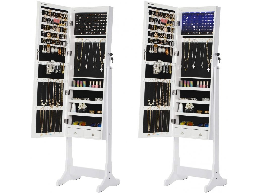 Šperkovnice - organizér nabízí dostatek prostoru pro vaše poklady. - 84 háčků a 48 slotů na náušnice, 84 prstenových slotů, 32 náhrdelníků a náramkových háčků, 5 polic, 2 malé zásuvky, 1 držák na šátek a 1 šperkovnice