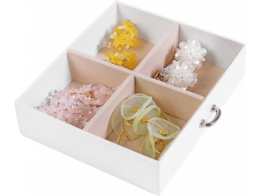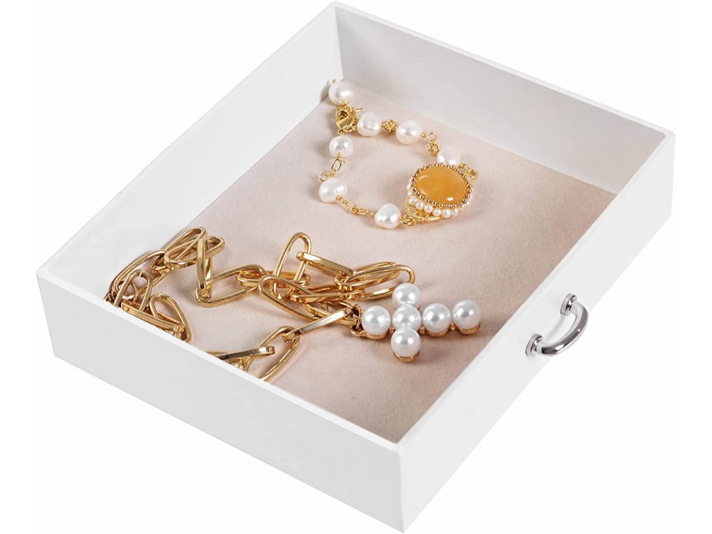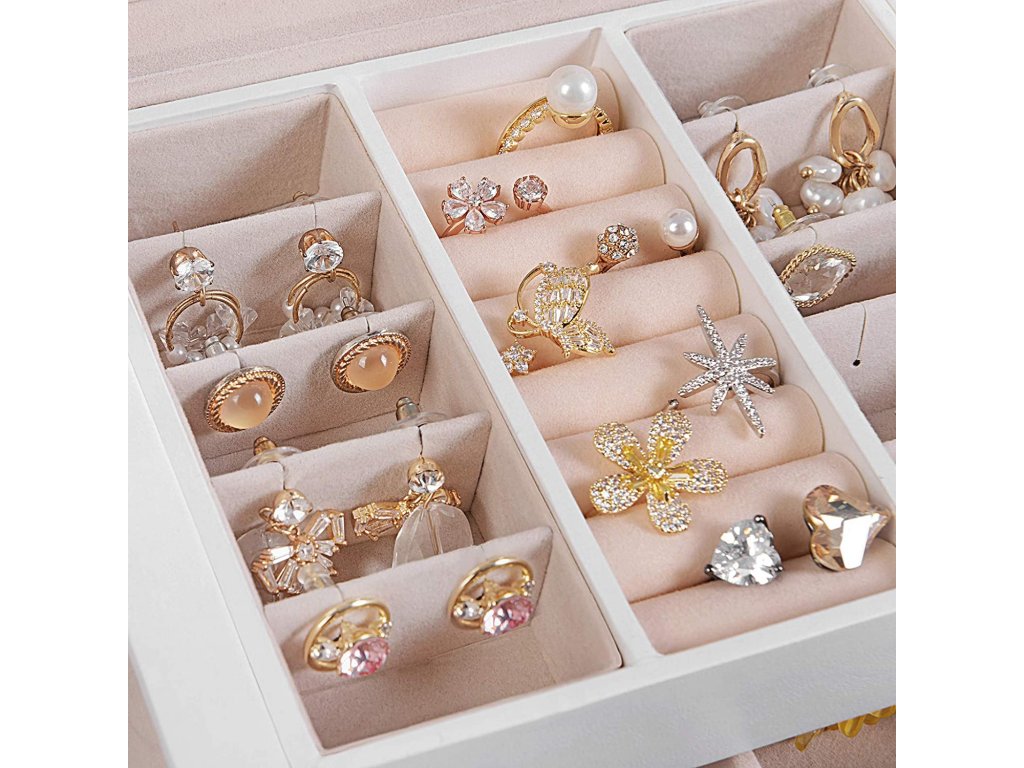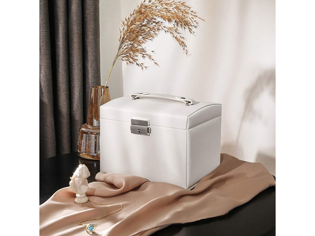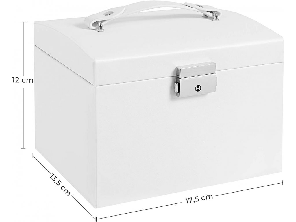 Bílá cestovní šperkovnice se zrcátkem s dvěma zásuvkami potěší každou dámu, která chce kdekoliv použít své šperky pro doplnění svého vzhledu.