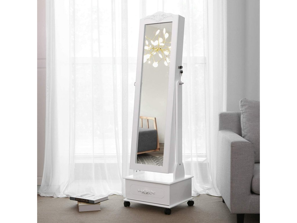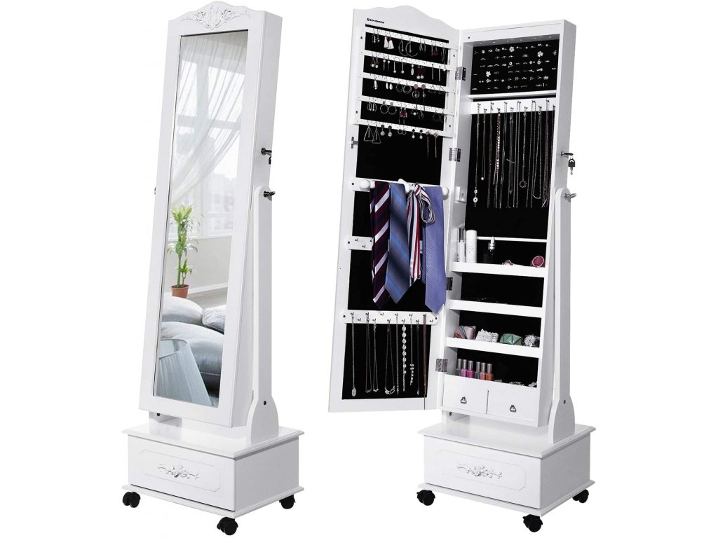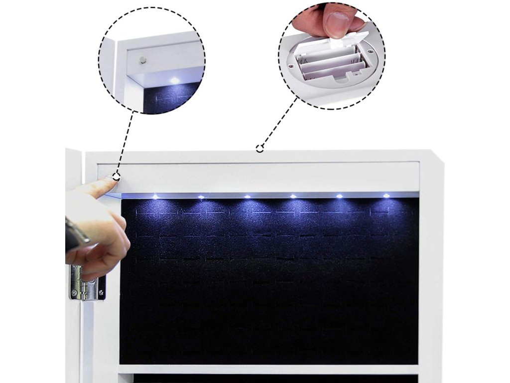 6 LED světel napájených 3 bateriemi AAA na horní straně osvětluje vaše doplňky při otevření dvířek zrcadlové šperkovnice, takže se vaše šperky třpytí a lesknou a nemusíte se oblékat po tmě.