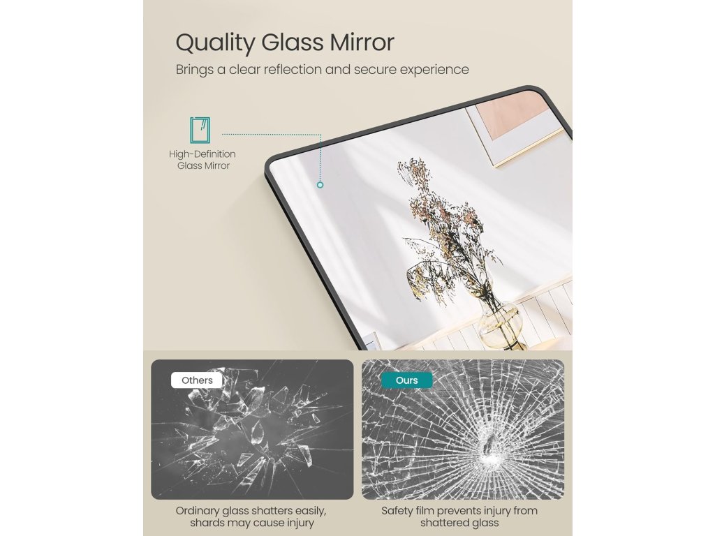 Zrcadlo je vyrobeno z vysoce pevného tvrzeného skla s bezpečnostní fólií, což minimalizuje riziko rozbití a zajišťuje vaši bezpečnost i v ojedinělých případech rozbití.