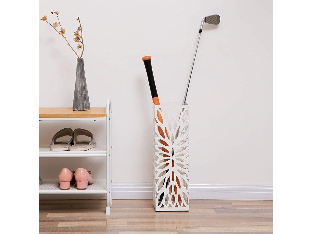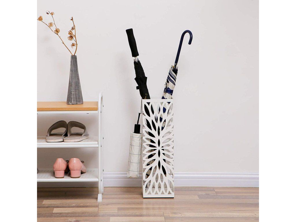 Tento moderní stojan na deštníky je praktický, dekorativní předmět pro uskladnění deštníků, vycházkových holí apod. Je vybaven odnímatelnou odkapávací miskou z plastické hmoty, která je navržena tak, aby chránila podlahu proti vlhkosti. Součástí stojanu jsou dva háčky, které slouží k zavěšení složených deštníků.