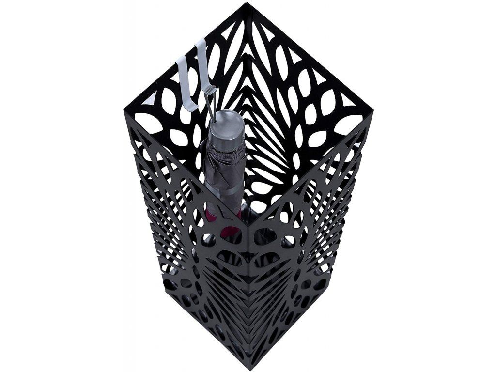 Tento moderní stojan na deštníky je praktický, dekorativní předmět pro uskladnění deštníků, vycházkových holí apod. Je vybaven odnímatelnou odkapávací miskou z plastické hmoty, která je navržena tak, aby chránila podlahu proti vlhkosti. Součástí stojanu jsou dva háčky, které slouží k zavěšení složených deštníků.