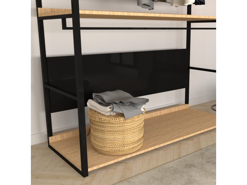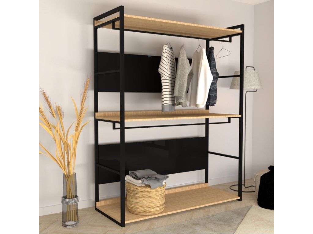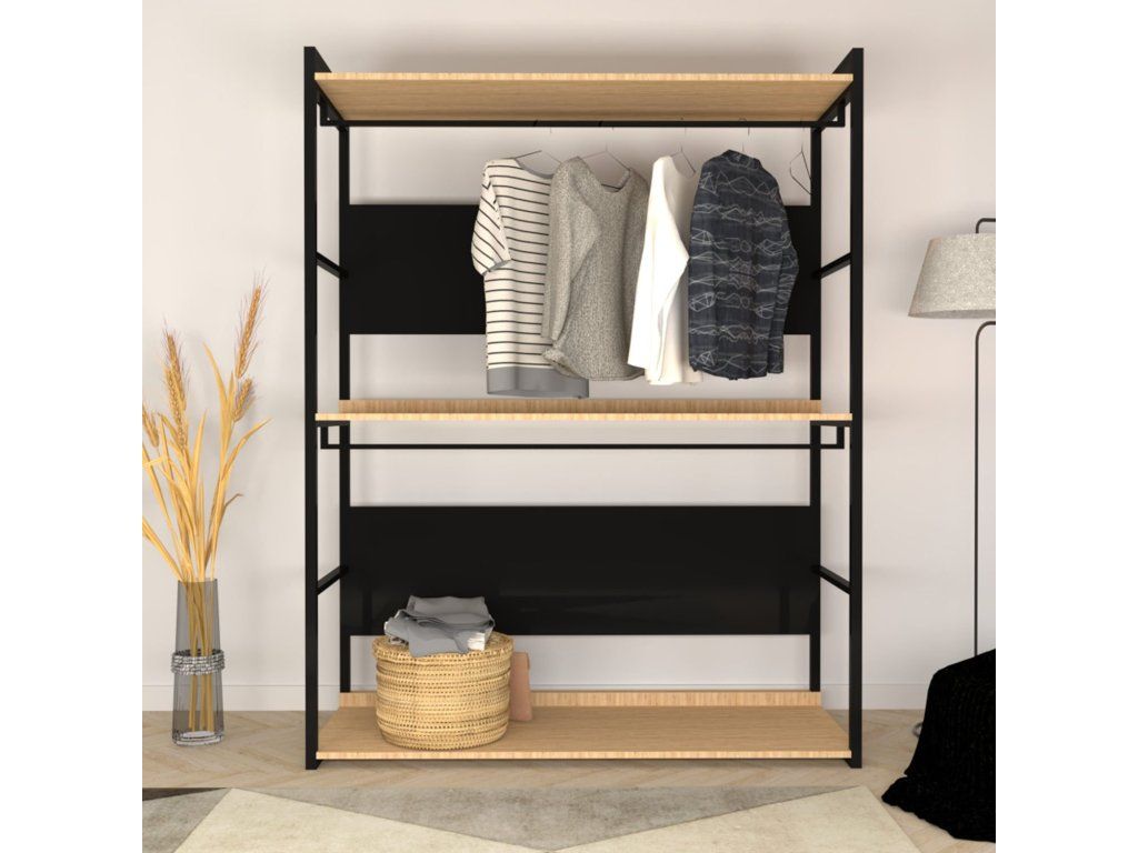 PERPA je praktický stojan na oděvy, vyrobený z černé kovové konstrukce s dvěma konzolemi pro zavěšení ramínek a ze dvou položených desek v dekoru dub a dvou svislých černých desek sloužících jako zadní stěna.