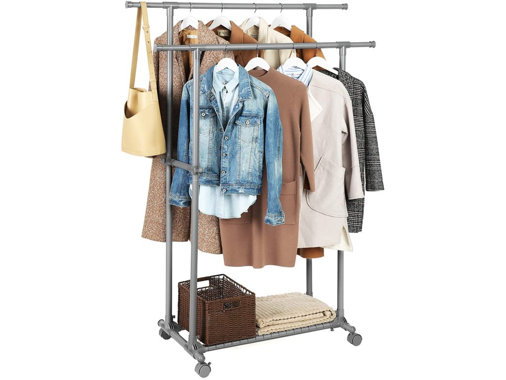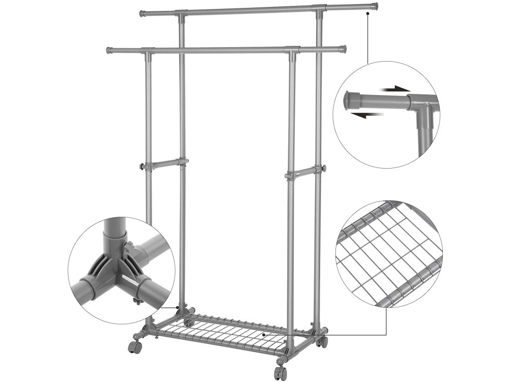 Tento stojan na šaty má 2 výsuvné tyče, 2 boční tyče pro šátky a opasky a 1 spodní polici pro vaše oblíbené boty. Nikdy nebudete mít nedostatek místa ve skříni!