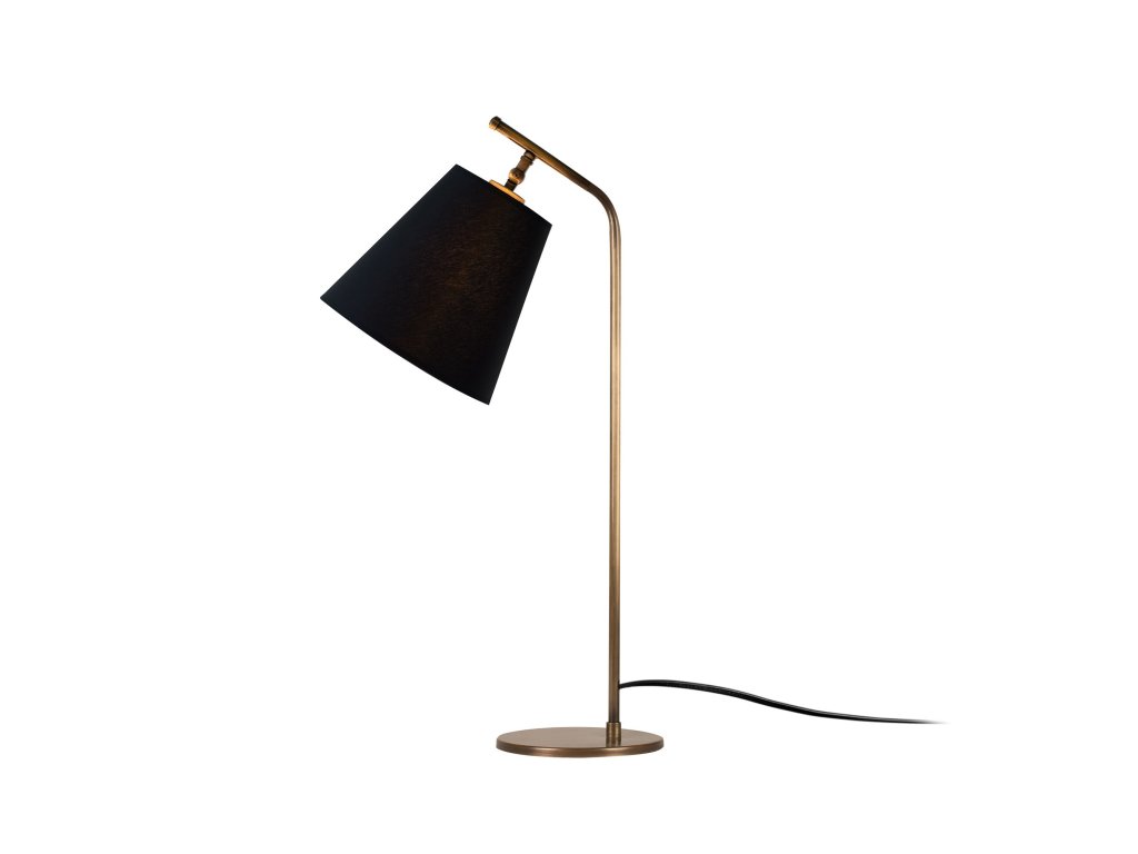 SALIHINI je stolní lampička vyrobená ze stabilního měděného těla, ukončeného nahoře černým sklopným stínítkem.