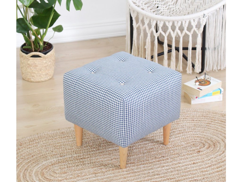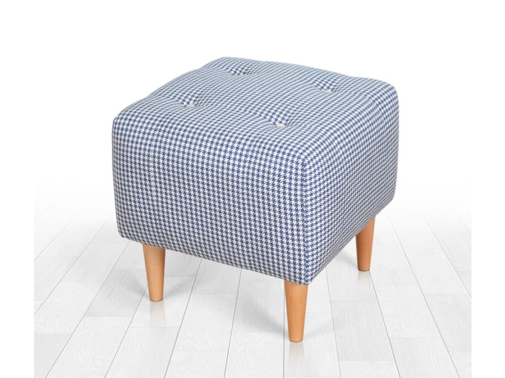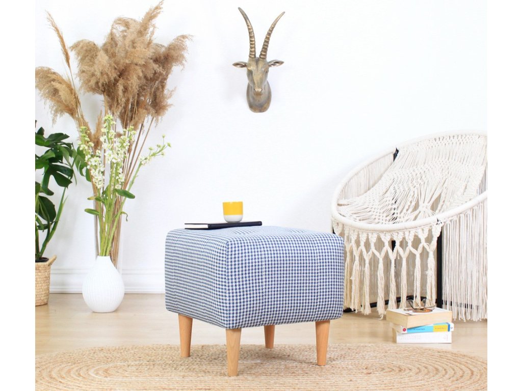 Moderní modro-bílý taburet DOTTED má potah vyrobený z 50% bavlny a z 50% lnu.